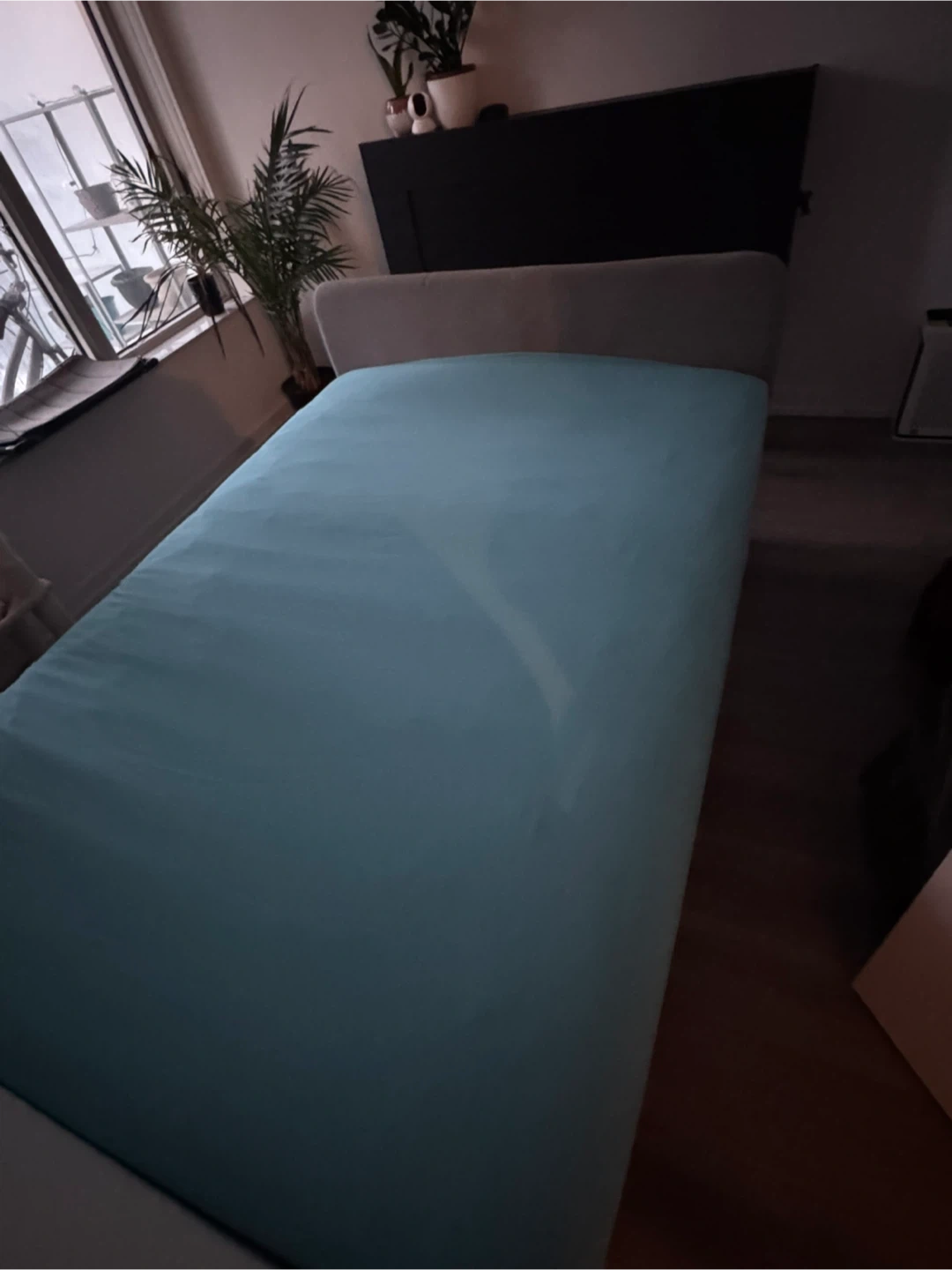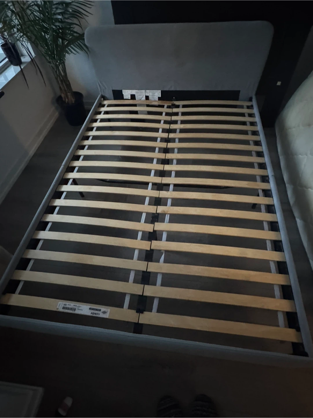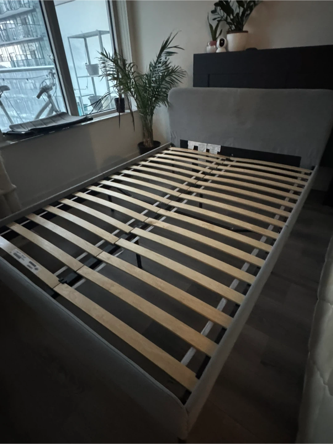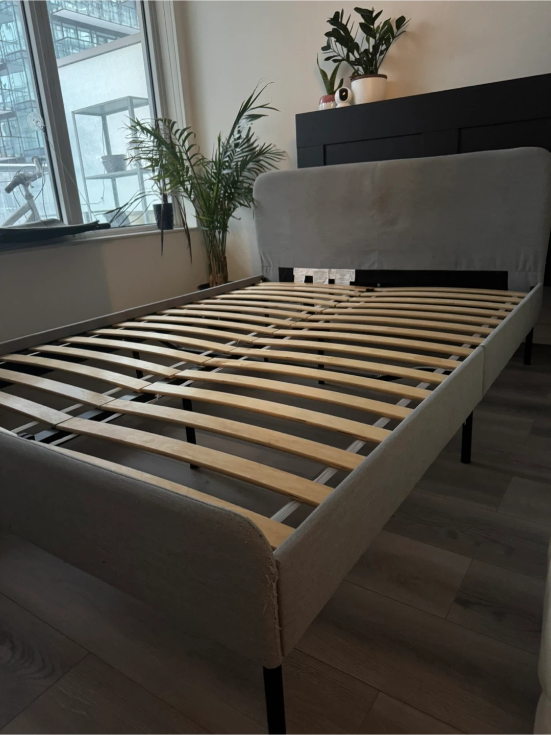 Selling a used IKEA SLATTUM upholstered bed frame in light gray. It's a full-size bed frame. Dimensions are 196cm (77 1/8") length and 139cm (54 3/4") width. Originally bought for $159. Less than 2 years ago. Good condition - minor scratching on bottom left corner. Selling as I’m moving and have purchased a larger bed.