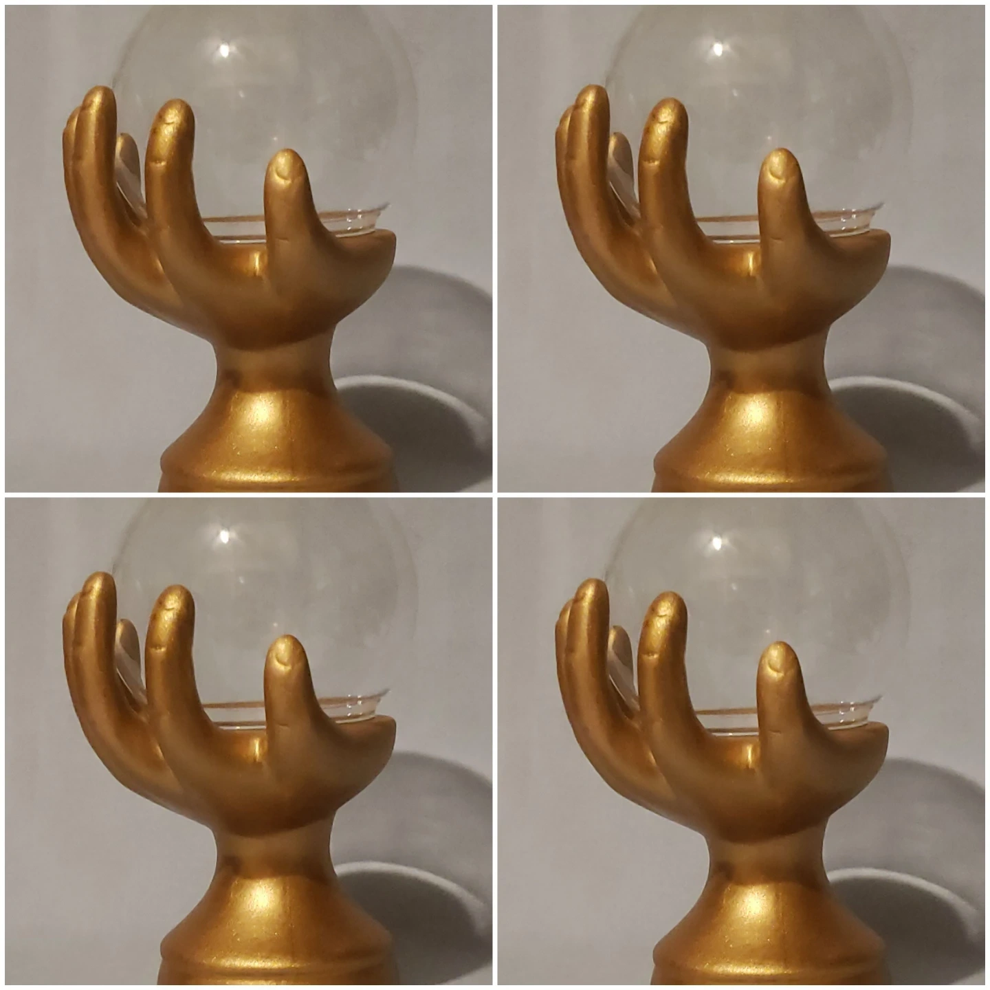 I'm selling 4 unique gold-colored hand display stand that comes with a clear glass globe. It's approximately 6 inches tall. This stand would be perfect for displaying small items or adding a touch of whimsy to your decor! Cash only pickup in Queens NY