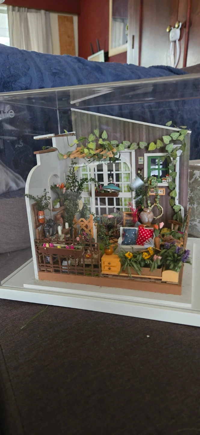 Selling a charming miniature dollhouse,! This book nook display garden scene comes with an acrylic box to protect this finished creation and keep it dust-free. It's a build and display on a book shelf