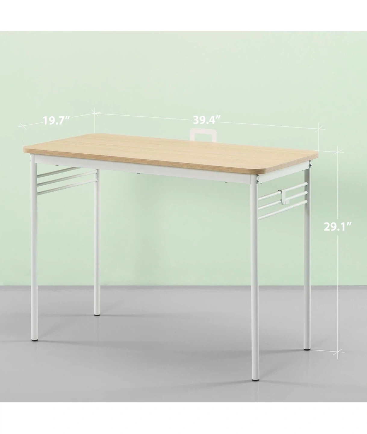 This desk features a light wood top and white metal frame. It's a great size for a home office or study space! The dimensions are approximately 39.4 inches in length and 19.7 inches in width, with a height of about 29.1 inches.