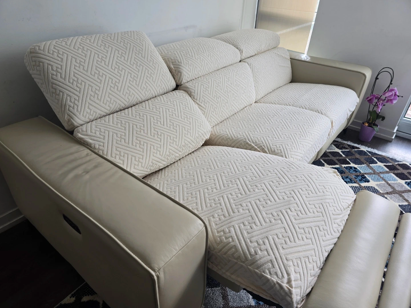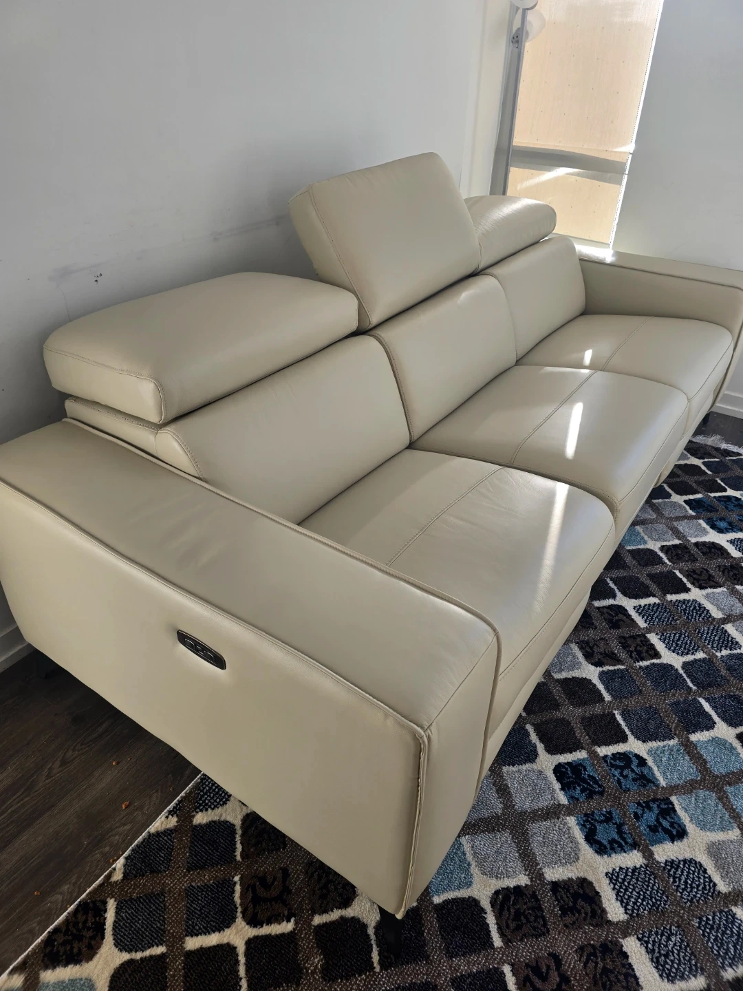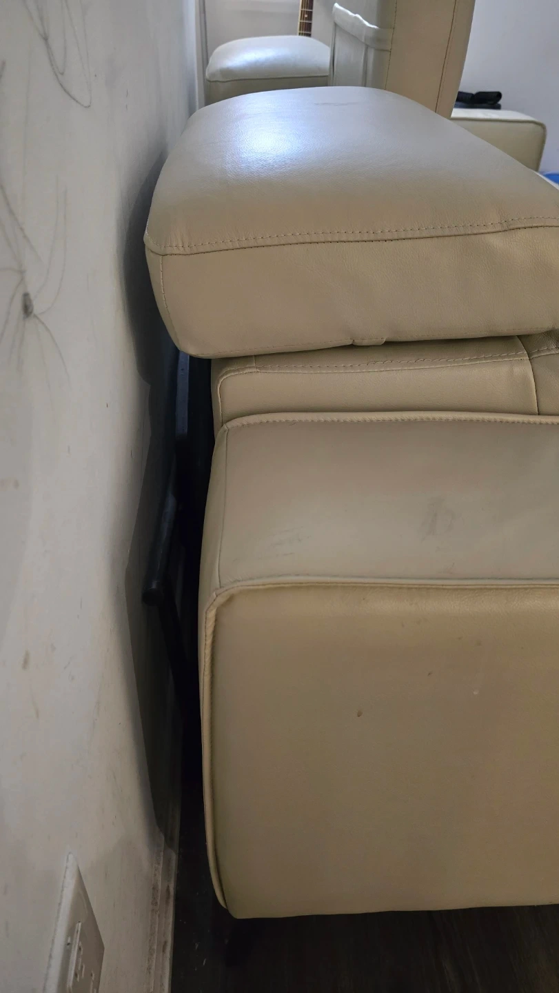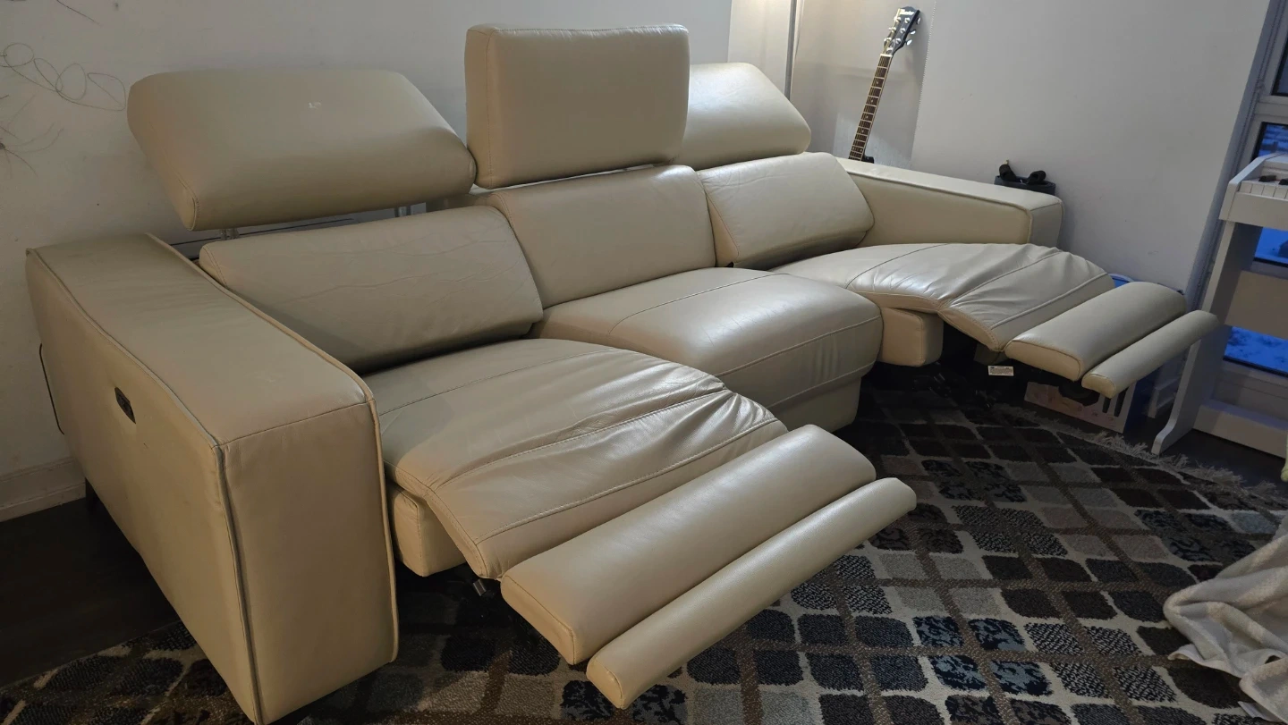 Selling a comfortable real beige leather reclining sectional sofa. It's in great shape and perfect for a living room or entertainment space. The reclining feature makes it extra relaxing for movie nights or just lounging around.