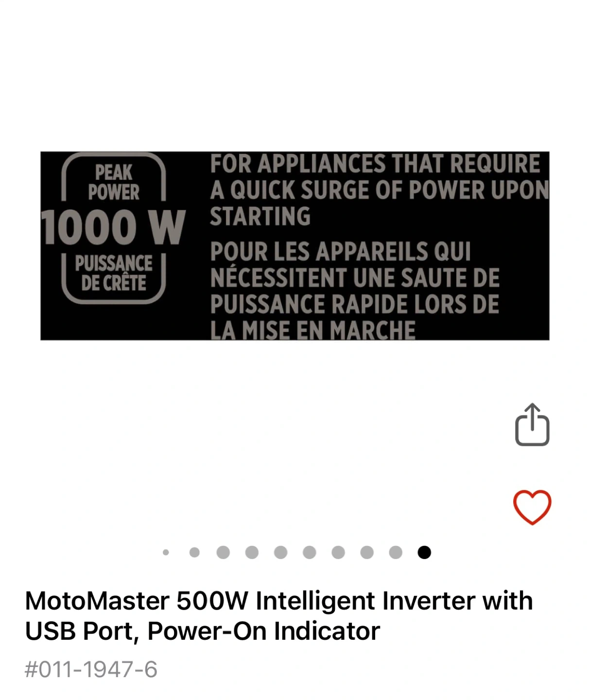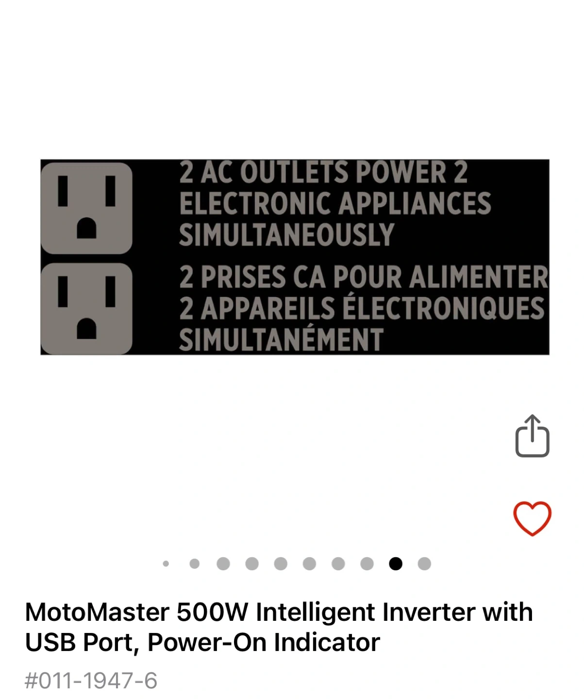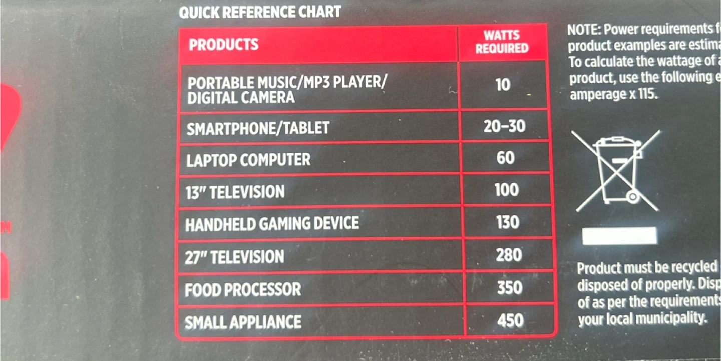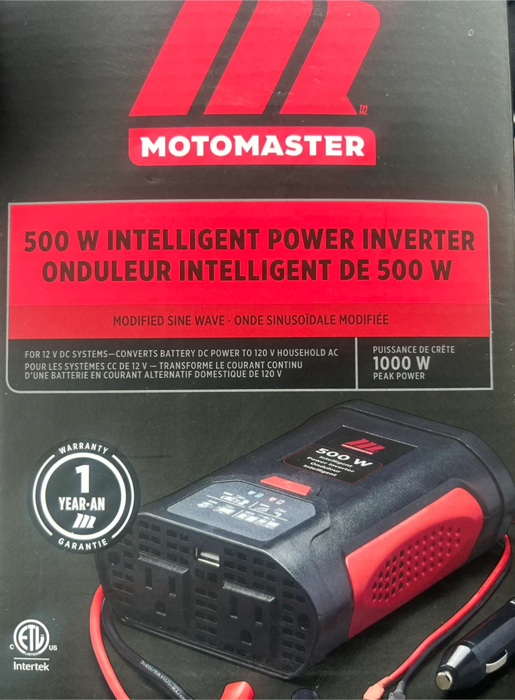 Selling a MotoMaster 500W Intelligent Power Inverter. It converts battery DC power to 120V household AC.