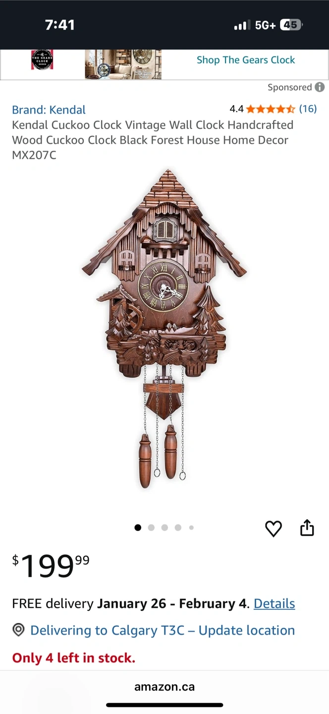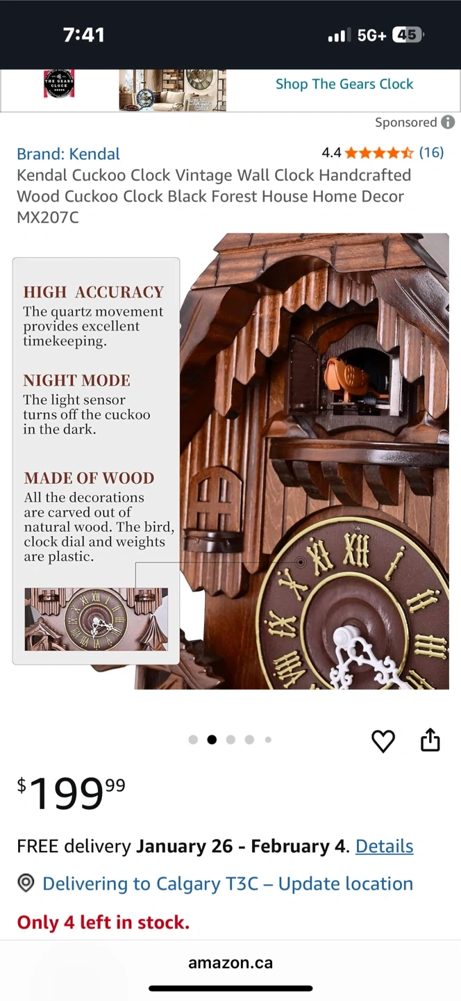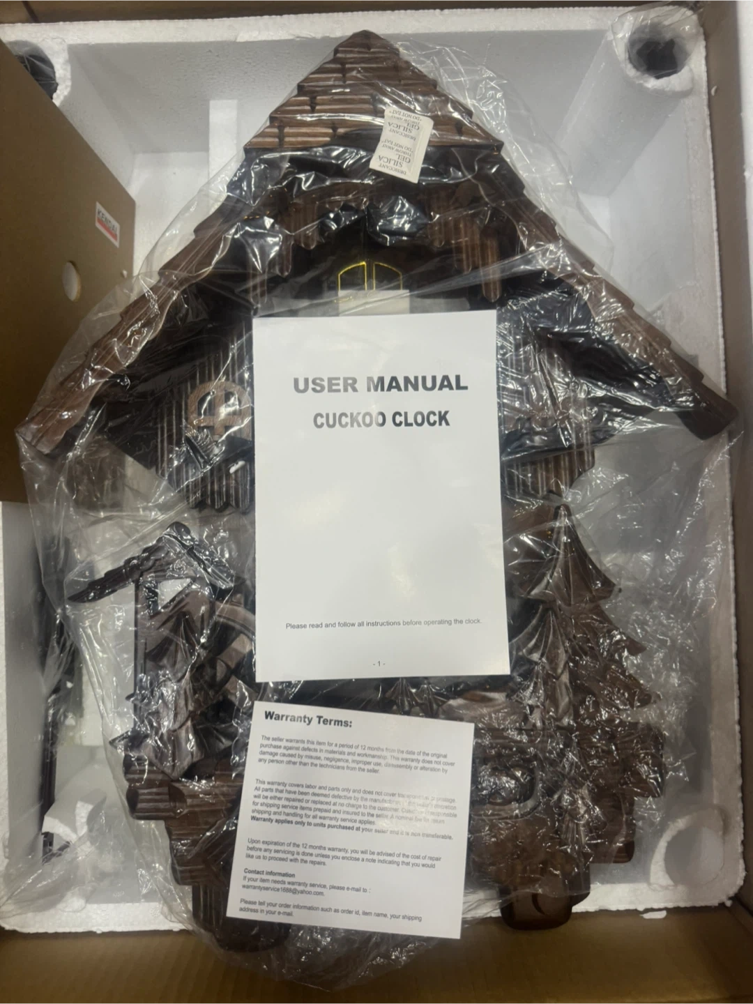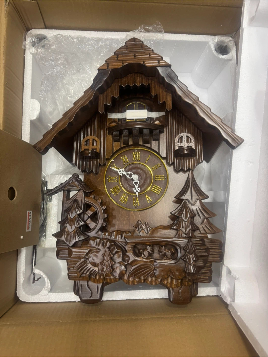 Kendal Cuckoo Clock Vintage Wall Clock Handcrafted Wood Cuckoo Clock Black Forest House Home Decor MX207C. The quartz movement provides excellent timekeeping. The light sensor turns off the cuckoo in the dark. All the decorations are carved out of natural wood. The bird, clock dial and weights are plastic. Comes with User Manual Cuckoo Clock.