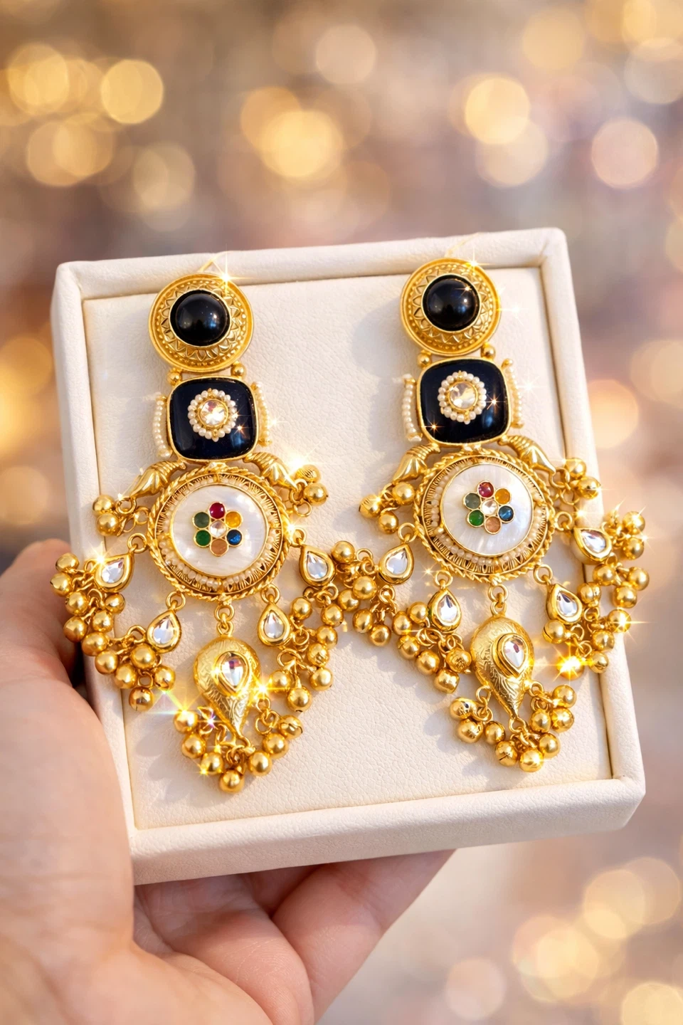 These are a unique pair of statement earrings, perfect for adding a touch of elegance to any outfit! They feature a mix of colours and textures with gold accents, making them a real eye-catcher. Fixed price is $20.