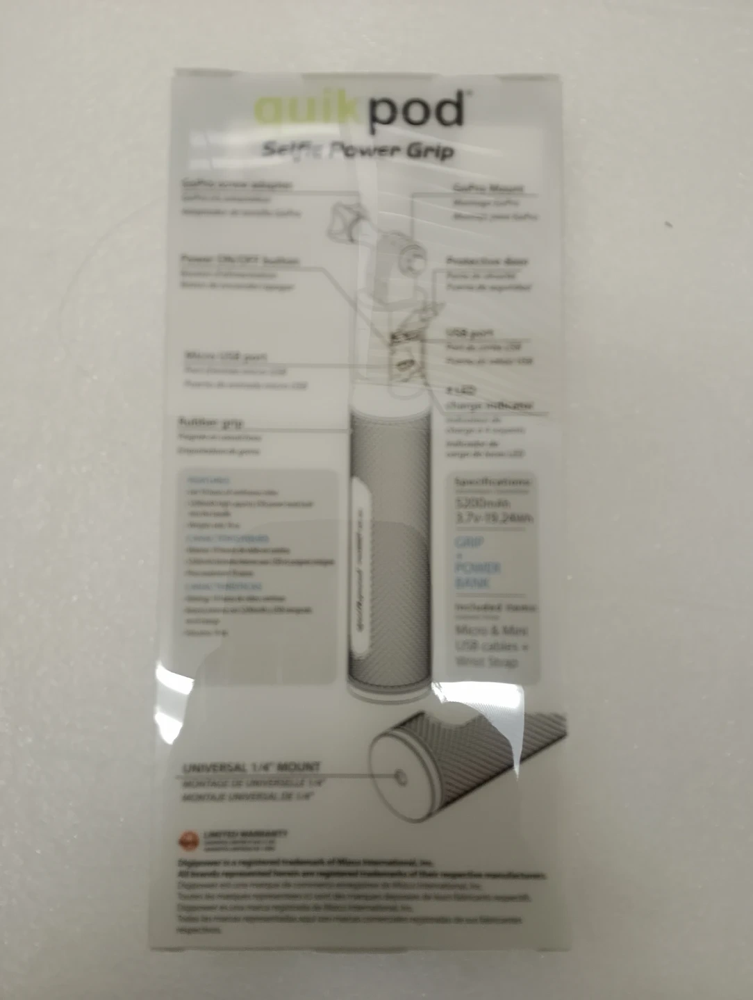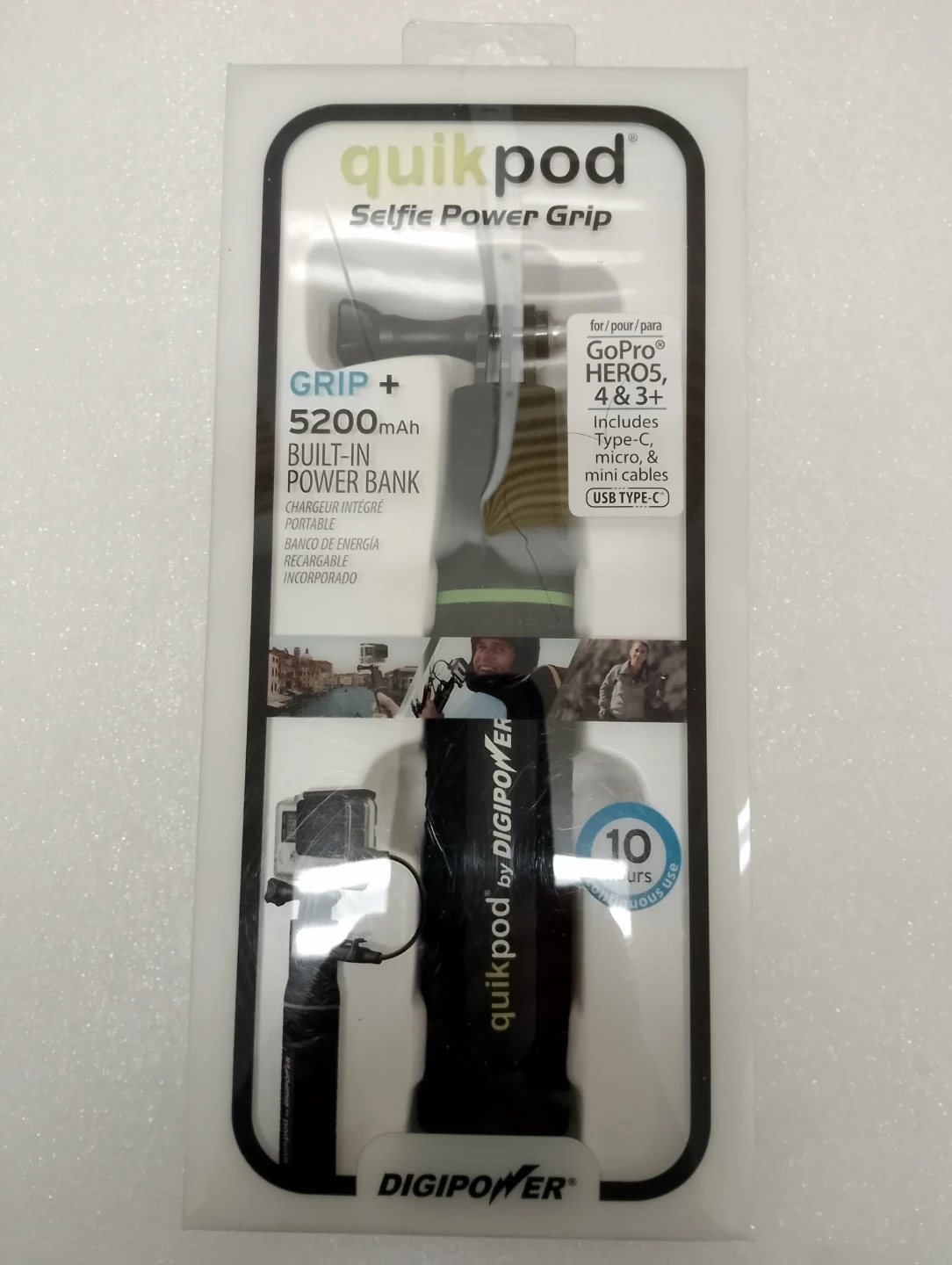 Selling a Quikpod Selfie Power Grip, perfect for your GoPro adventures! It's a grip and a built-in 5200mAh power bank, so you can keep your GoPro charged for up to 10 hours. Compatible with GoPro HERO5, 4, and 3+. Includes Type-C, micro, and mini USB cables.