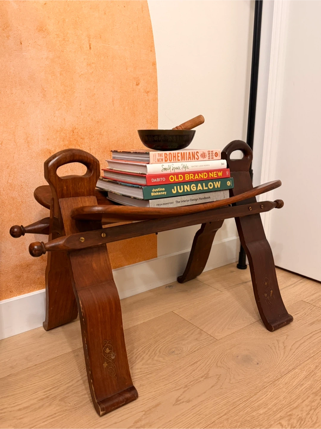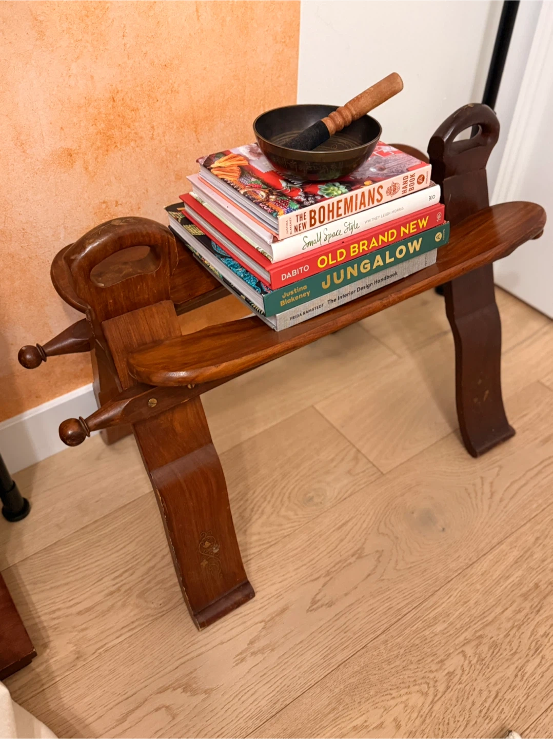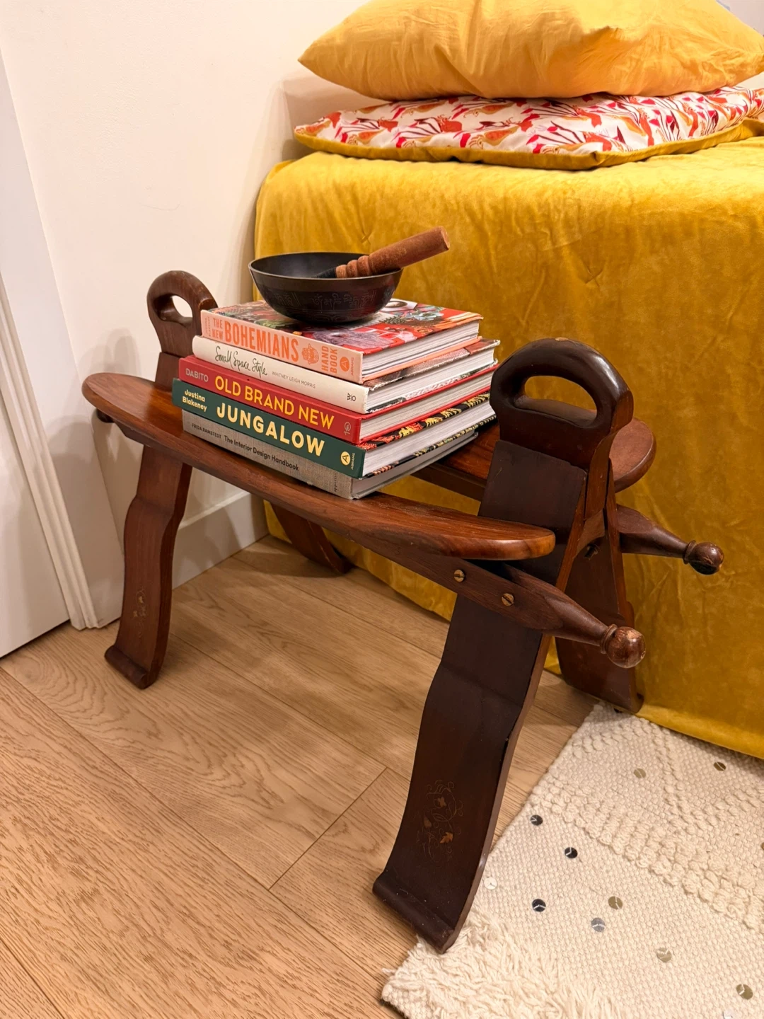 Selling a unique vintage wooden camel saddle stool. This piece is perfect as a decorative item or a small side table. It has a distinctive design and has been quite a conversation piece.