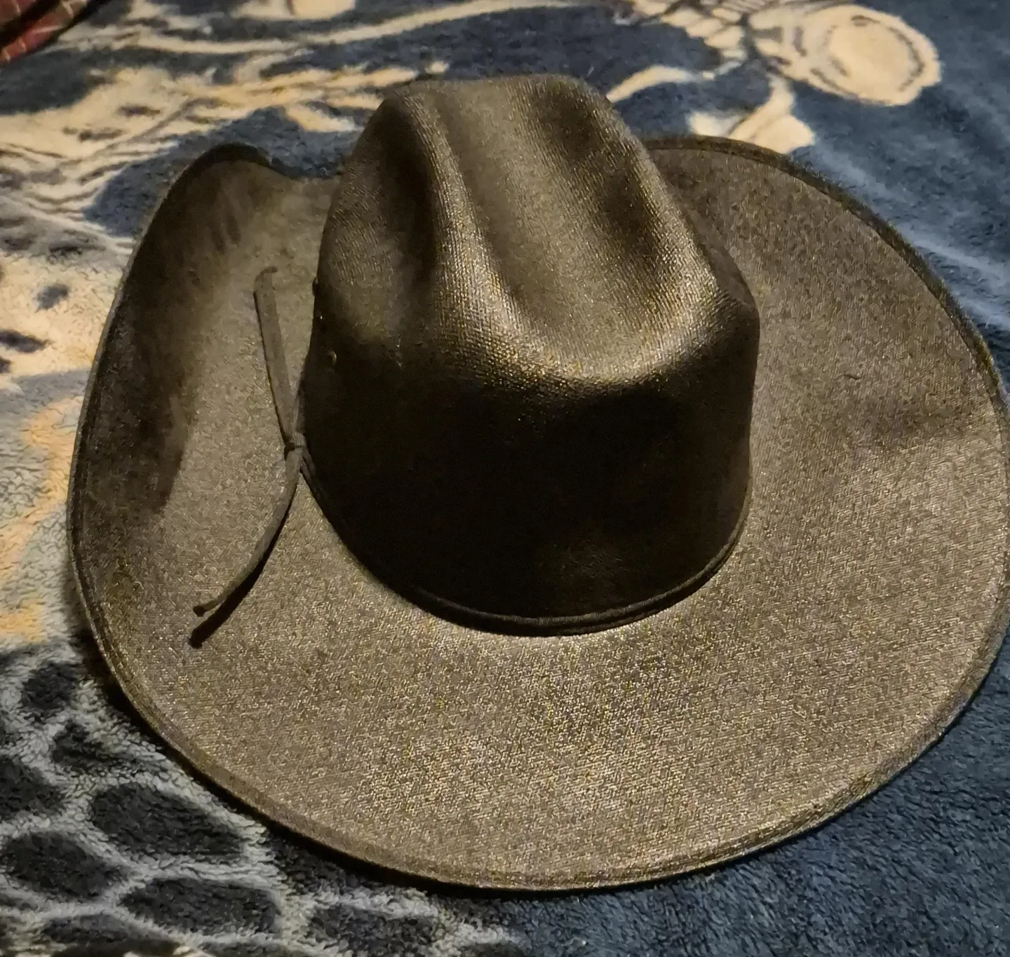 Selling a black cowboy hat! It has a classic shape and design, perfect for adding a touch of Western flair to any outfit! It is in good condition.