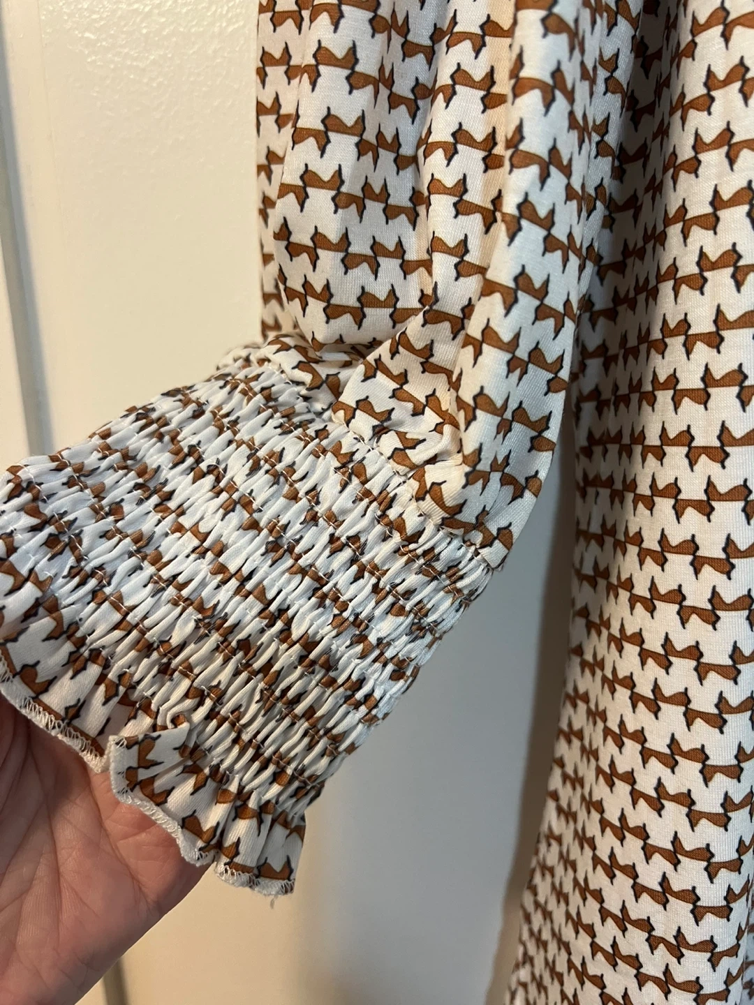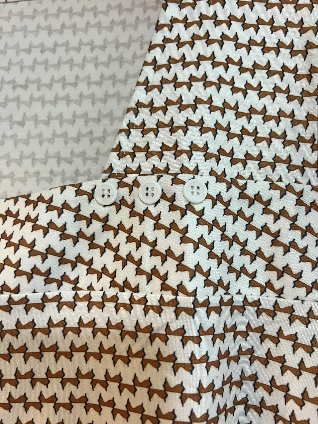 Selling a cute patterned blouse! It features a unique brown and off white design, perfect for adding a touch of style to any outfit. It has long sleeves with elasticated cuffs and a button design on neckline. 70% Rayon, 25 Rayon & 5 Spandex~Wash & Hang to Dry. NWOT