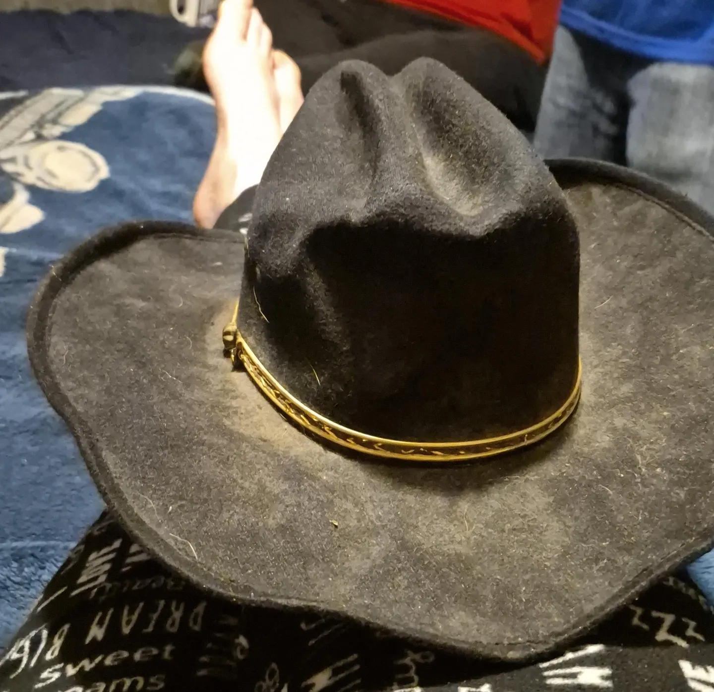 Selling a black cowboy hat that has a gold trim around the brim. It's in good condition and ready for a new owner!