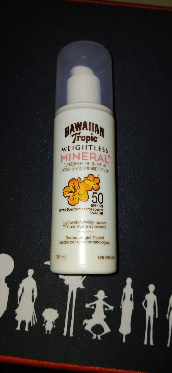 Offering a bottle of Hawaiian Tropic Weightless Mineral Sunscreen with SPF 50