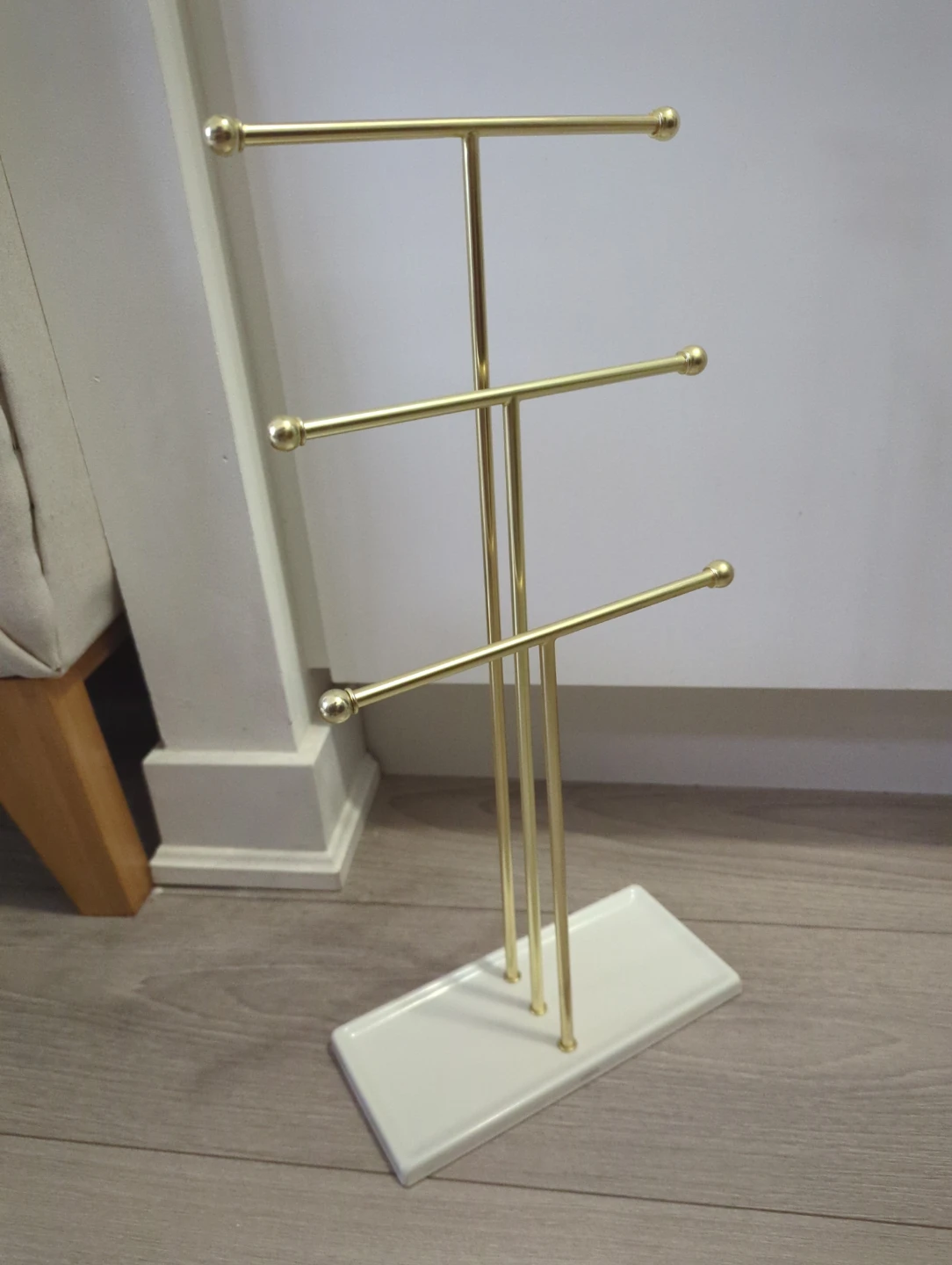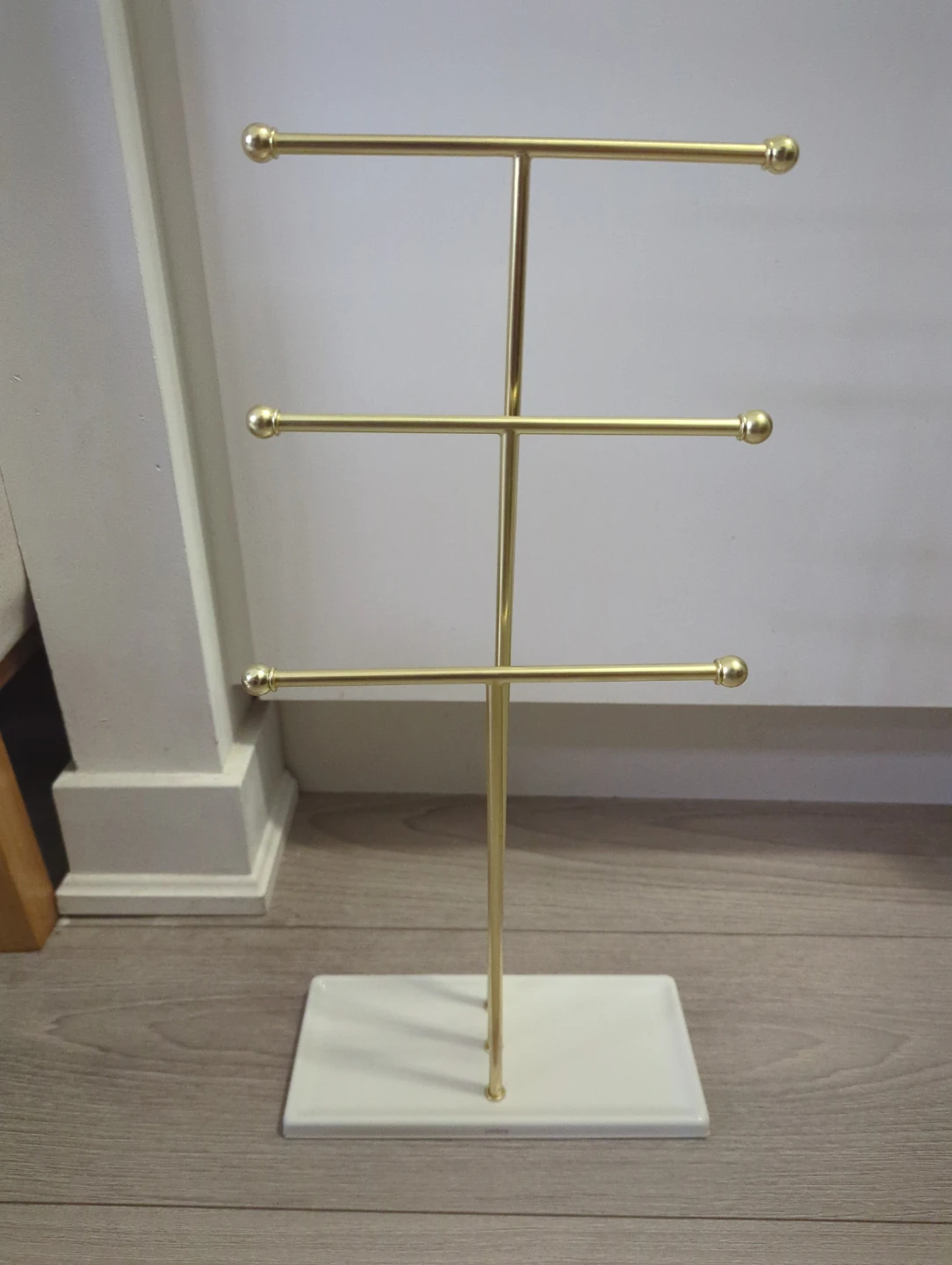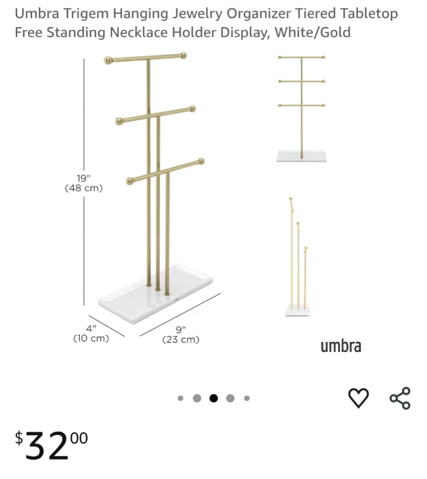 Selling a lovely Umbra Trigem hanging jewelry organizer! It's a tiered tabletop free-standing necklace holder display in a stylish white and gold finish. It measures 19" (48 cm) in height, with a base of 9" (23 cm) by 4" (10 cm). Originally bought for $32