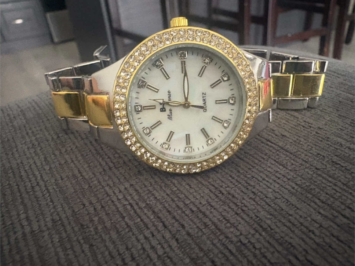 This is a beautiful B-S Blue Sense quartz watch. It features a silver and gold band with a rhinestone-studded bezel. The watch face is mother-of-pearl, adding a touch of elegance. Perfect for adding a bit of sparkle to your everyday look