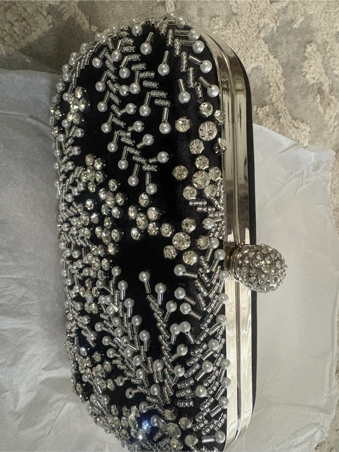 This elegant black evening clutch is perfect for special occasions! It features beautiful beadwork and a silver-tone chain strap.