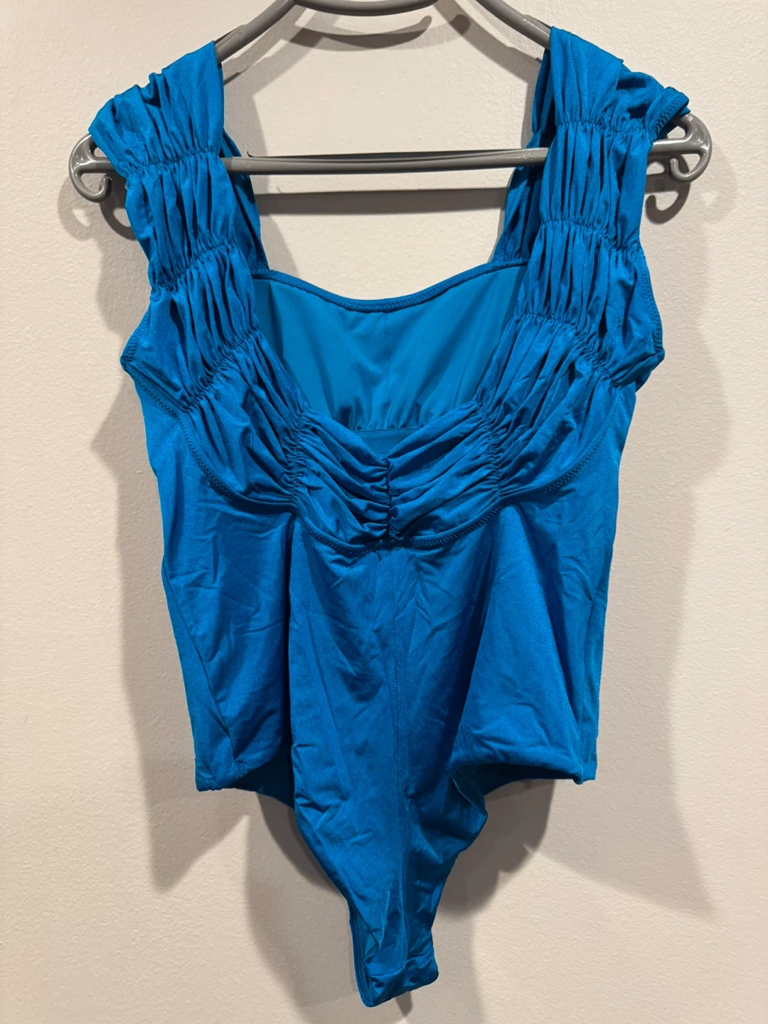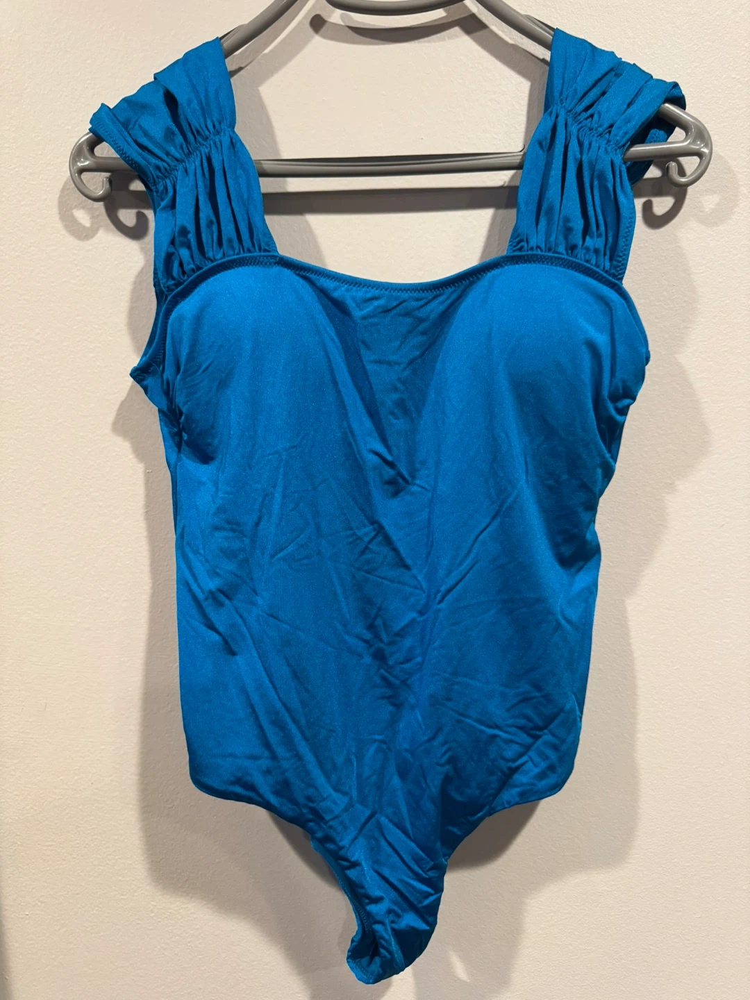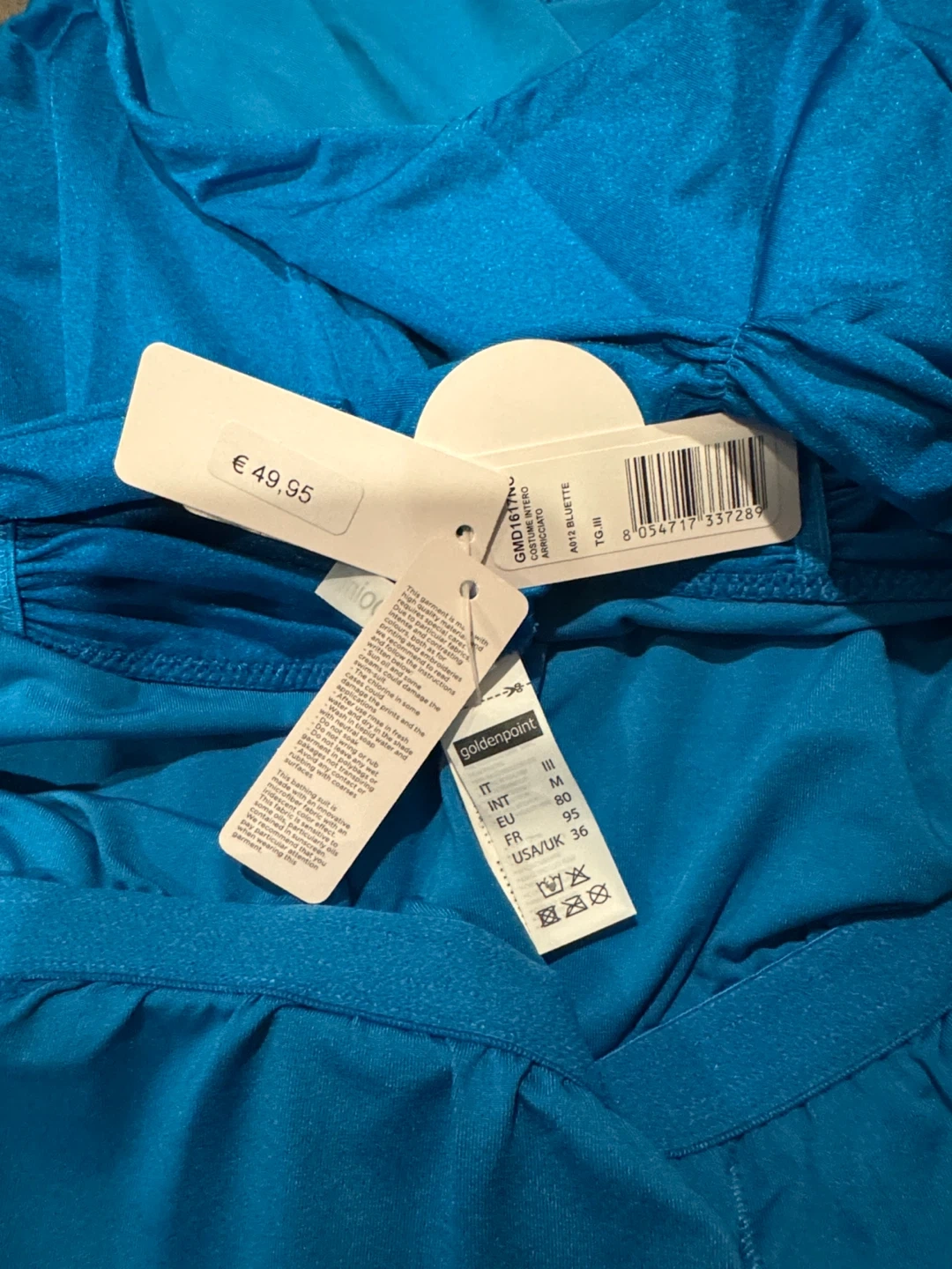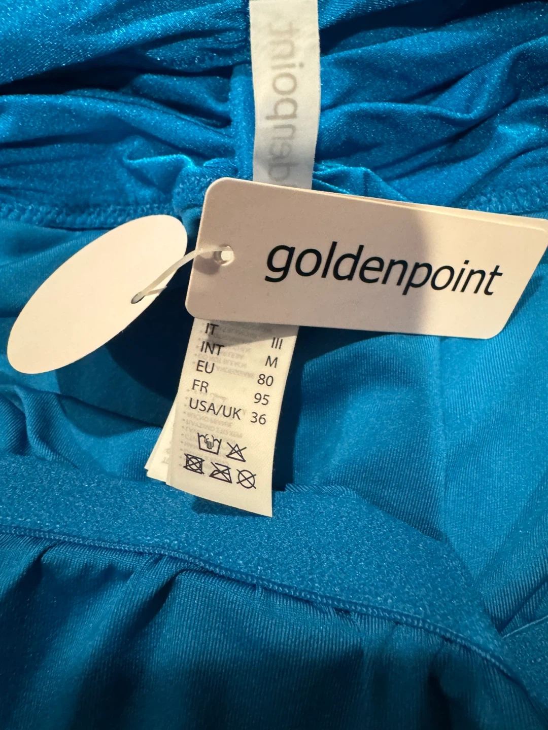 This is a Goldenpoint bodysuit in a beautiful blue color. The size is M, equivalent to USA/UK 36. It's in great condition and ready for a new owner!