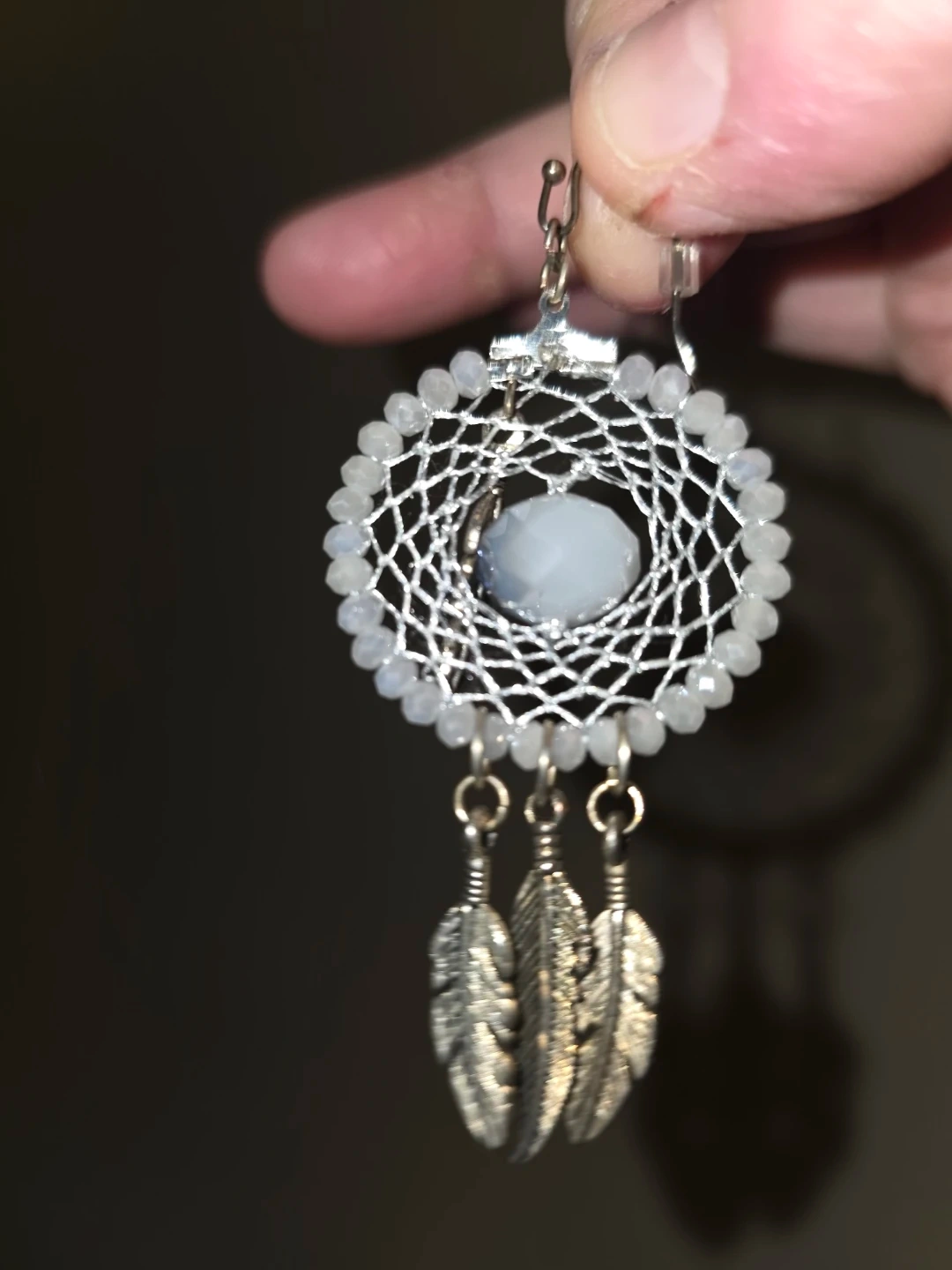 These are some beautiful dreamcatcher earrings! They feature a delicate web design with small beads and three silver-coloured feathers hanging below. Perfect for adding a touch of bohemian style to any outfit