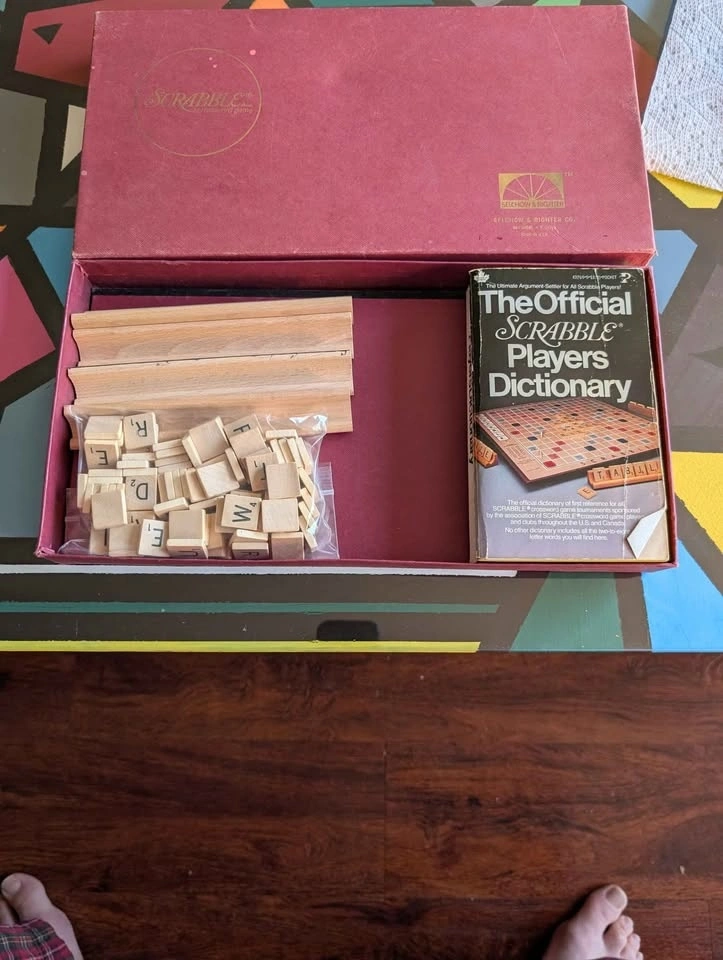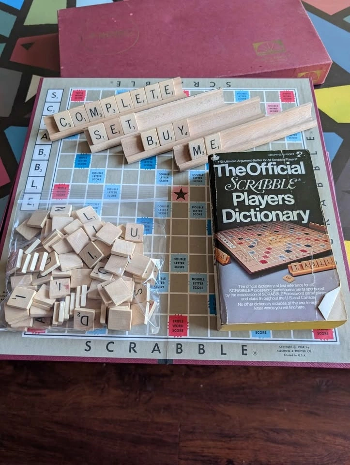 Downsizing and selling a Scrabble board game. This classic board game has all the pieces (yes I verified) plus the official Scrabble dictionary. The box shows it's age. Ready to be played.
