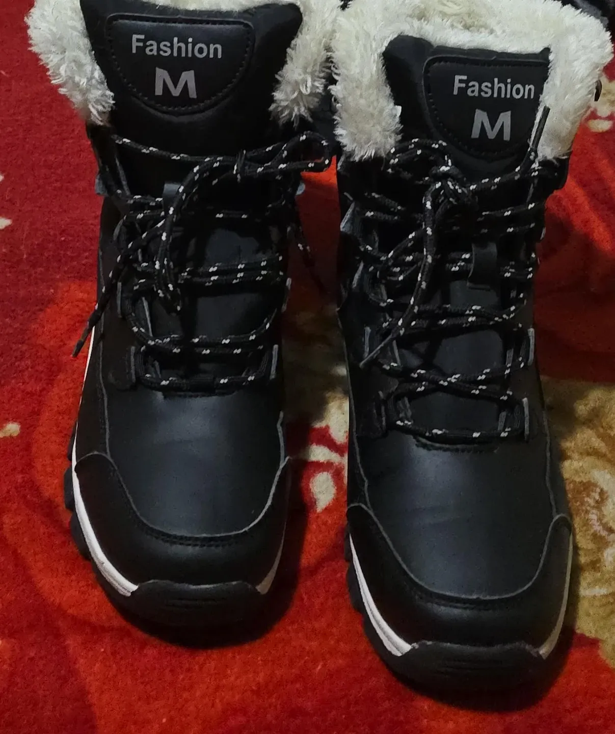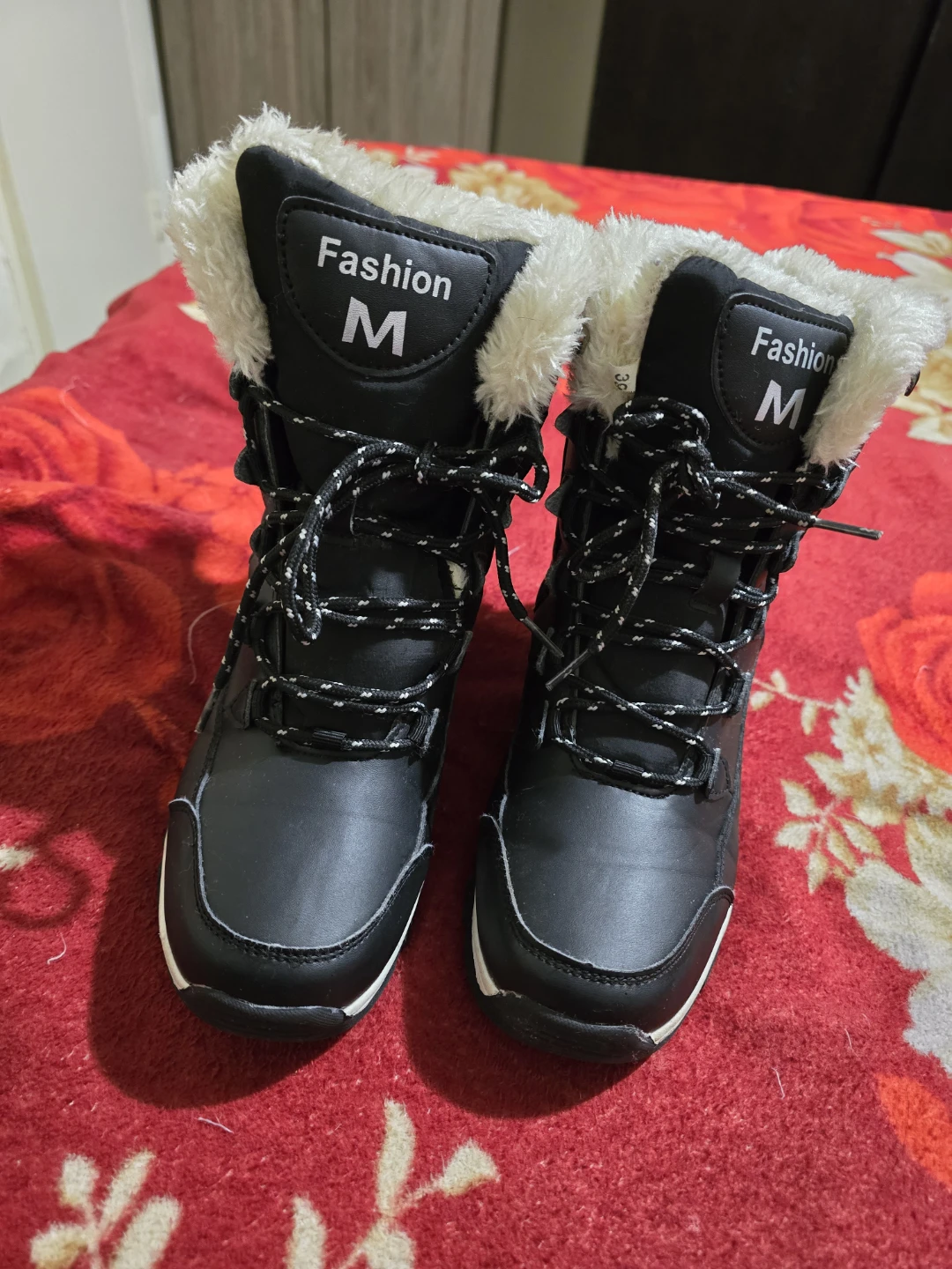 These Fashion M winter boots are perfect for keeping your feet warm and stylish during the colder months! They feature a black exterior with a faux fur trim and lace-up closure for a secure fit. They are in good condition and ready for a new owner