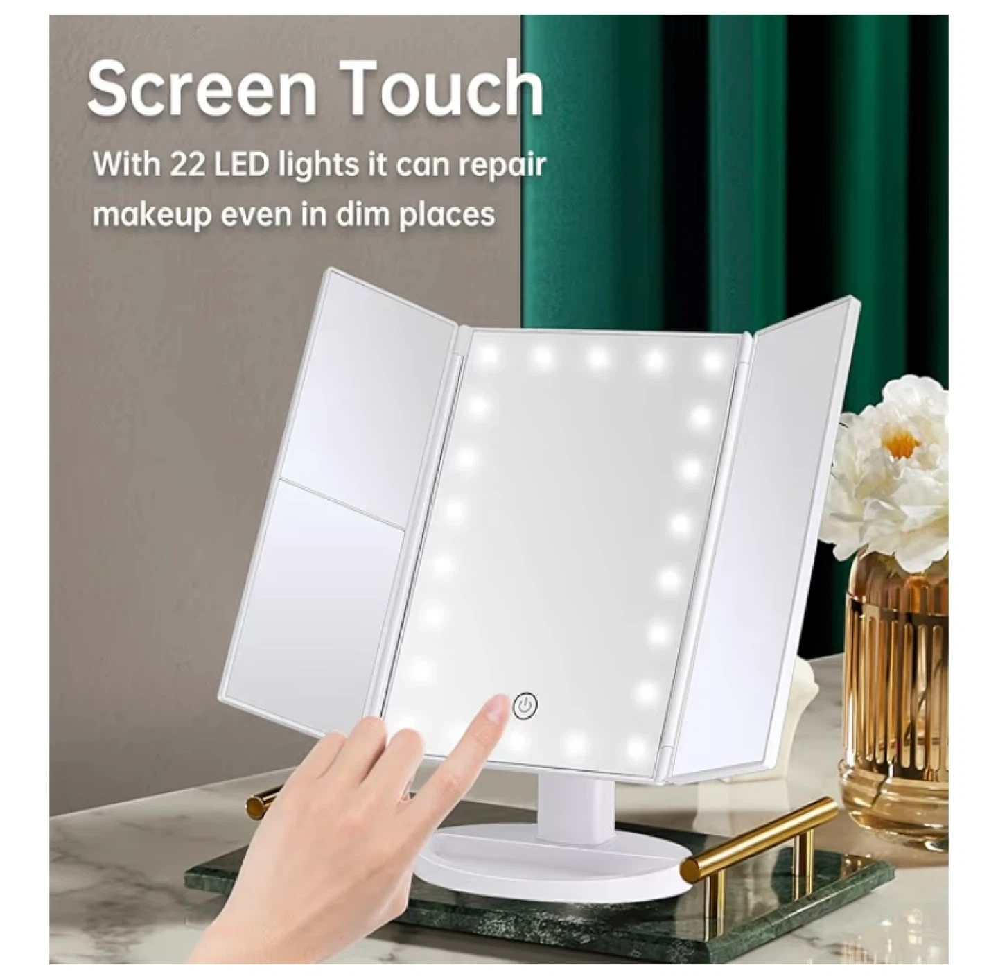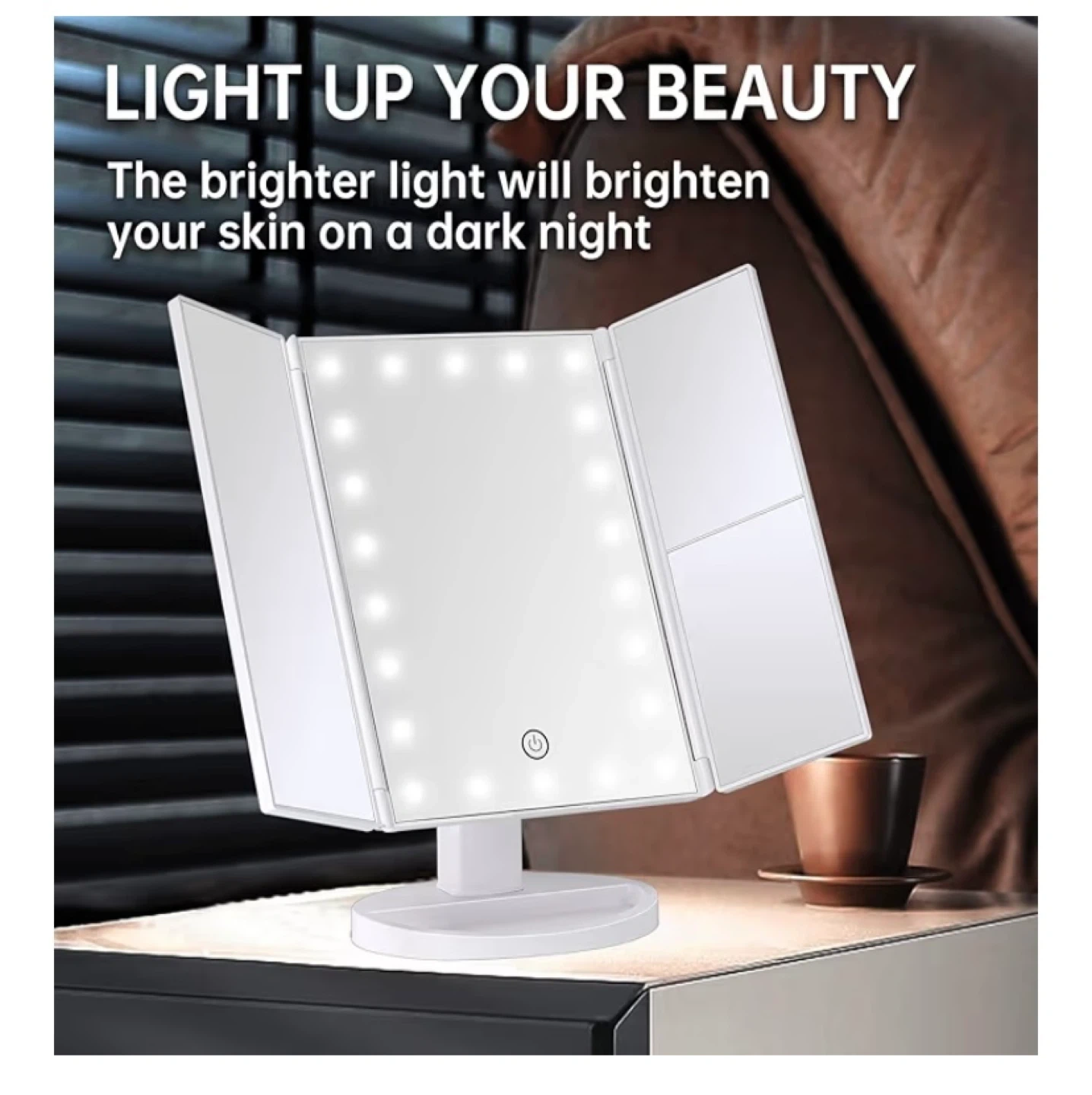Selling a tri-fold lighted vanity makeup mirror! It features a USB charging port, swivel joint, and rotation axis. There's also a mini storage base, perfect for tiny make-ups. It requires 4xAAA batteries. It's designed to be lightweight and portable!