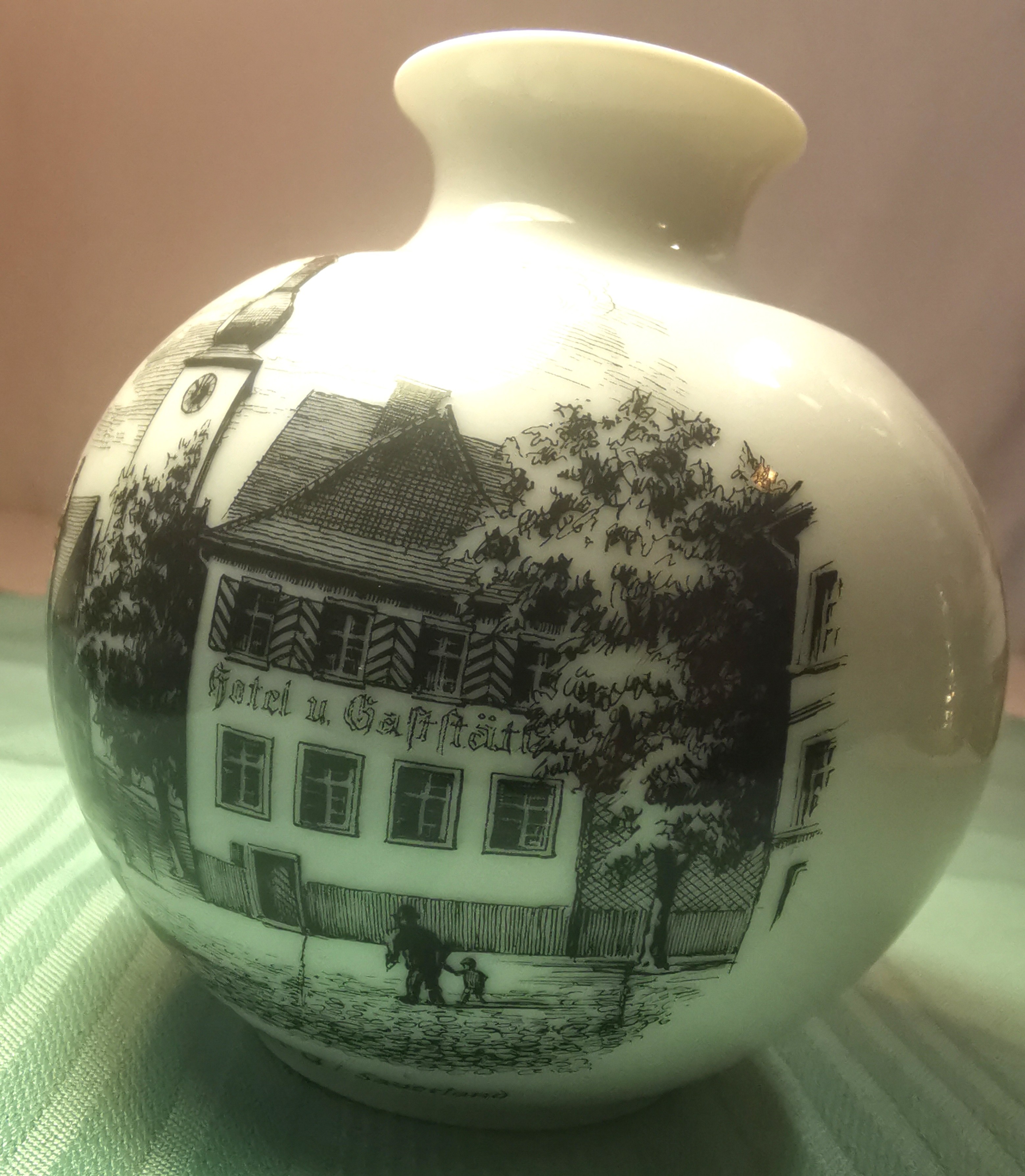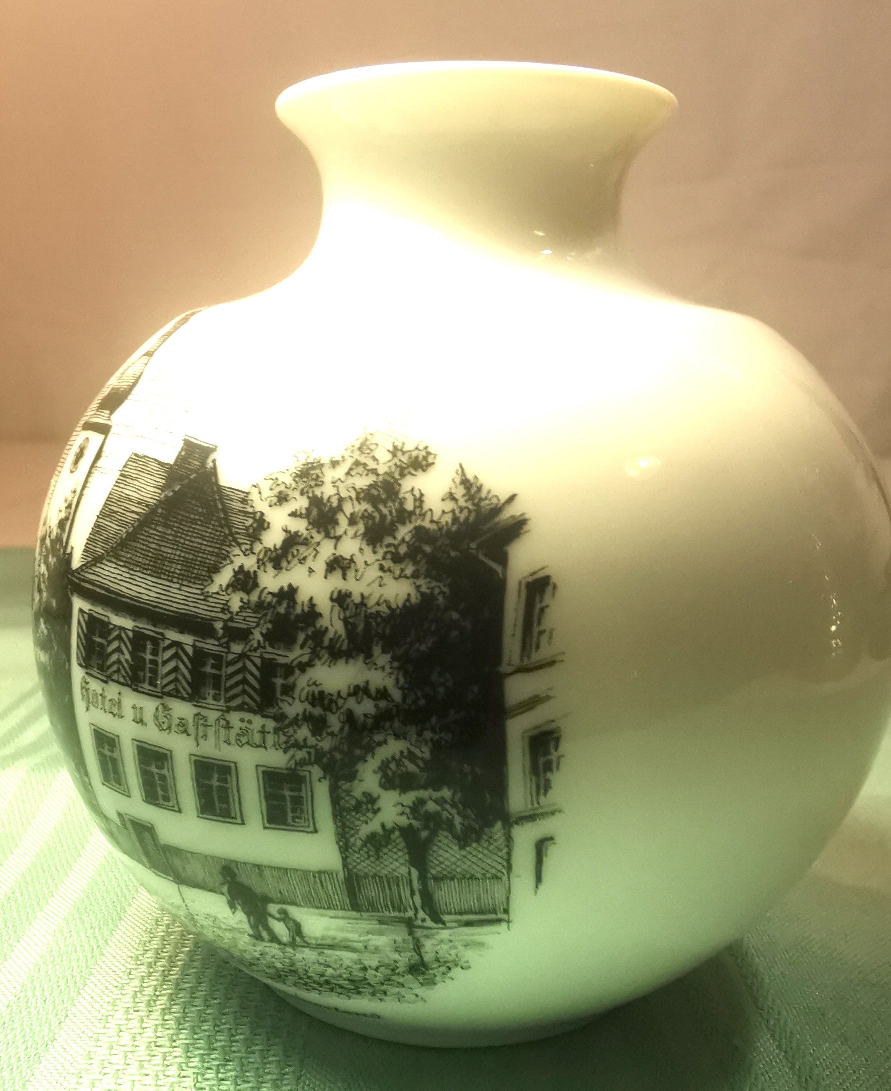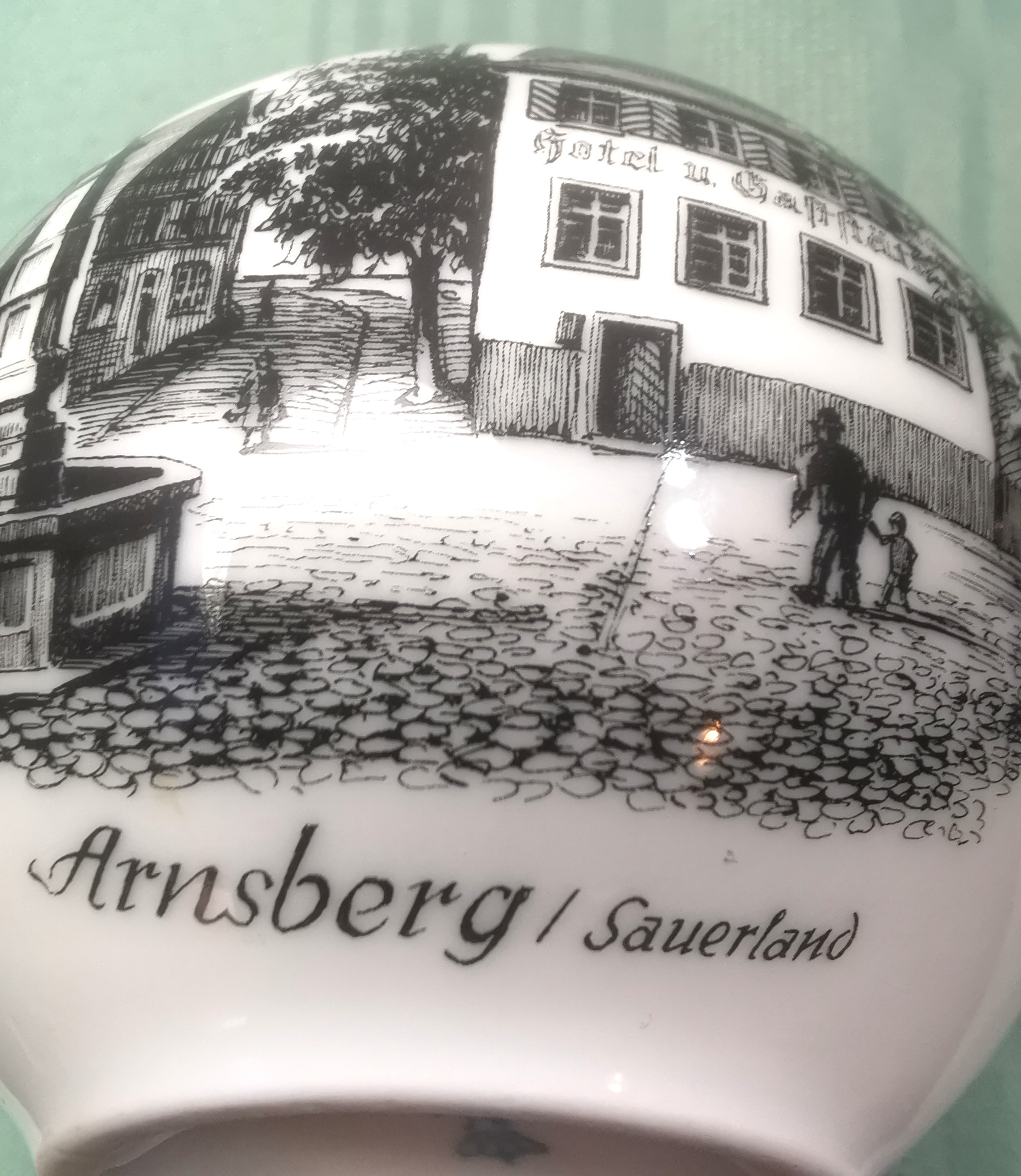 This is an exquisite piece of vintage West German porcelain from the world-renowned AK Kaiser manufactory. The vase features a high-gloss white glaze with a detailed black transferware scene of Arnsberg in the Sauerland region. The artwork captures the historic charm of the area, including the "Hotel u. Gaststätte" and the iconic local architecture.
