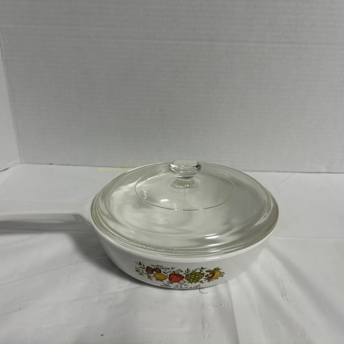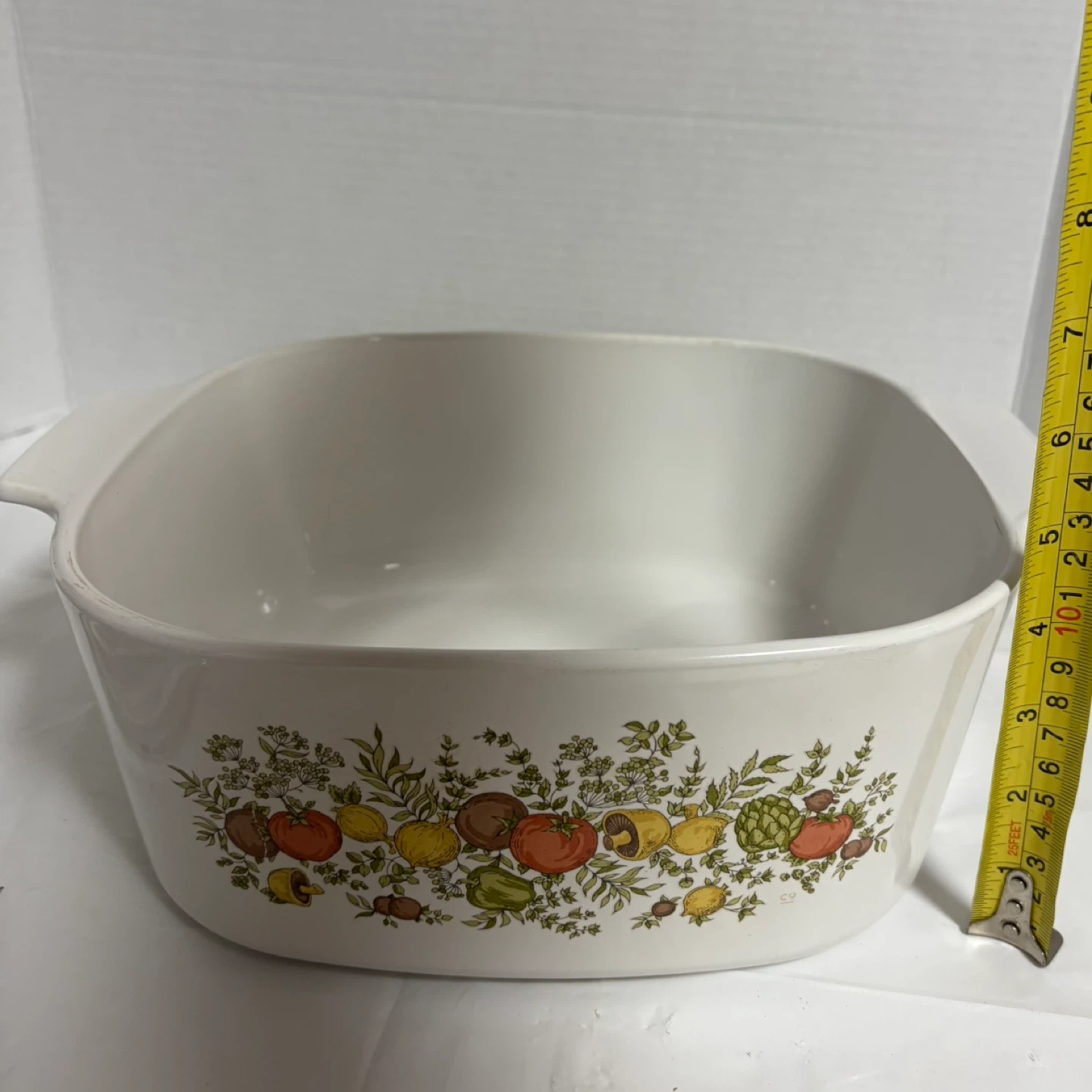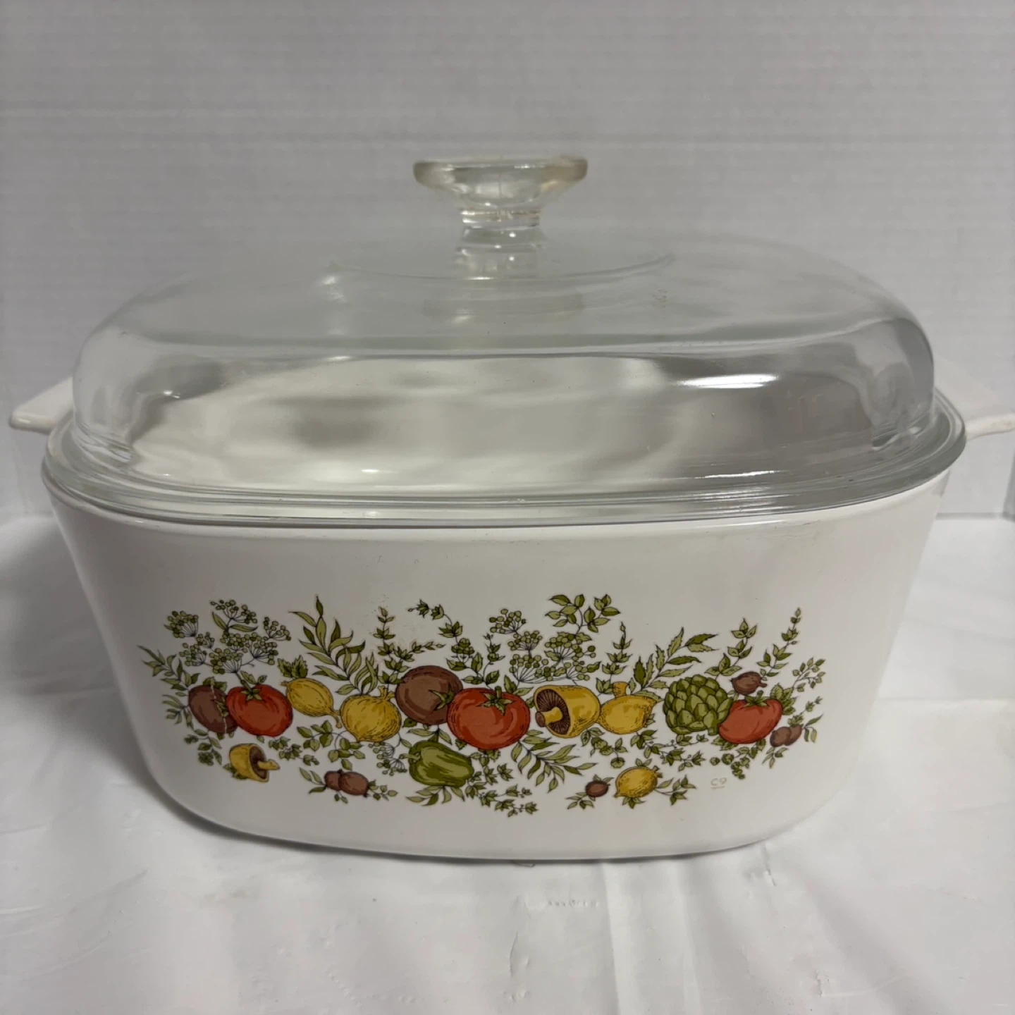 Selling a vintage Corning Ware casserole dish with the "Spice O' Life" pattern. It's in great shape and comes with a glass lid. The dish is white with a colourful vegetable design around the sides. Perfect for cooking and serving your favourite meals!