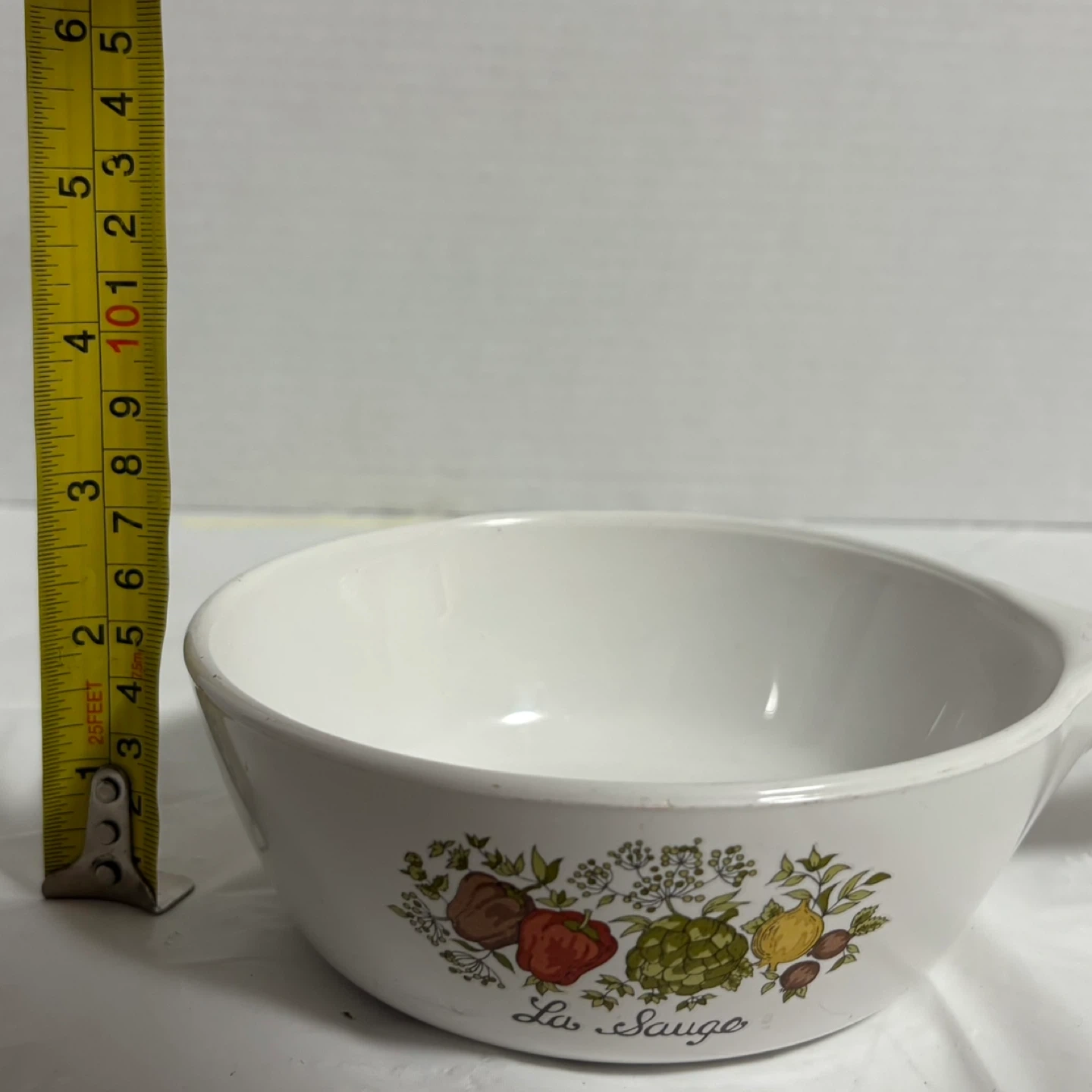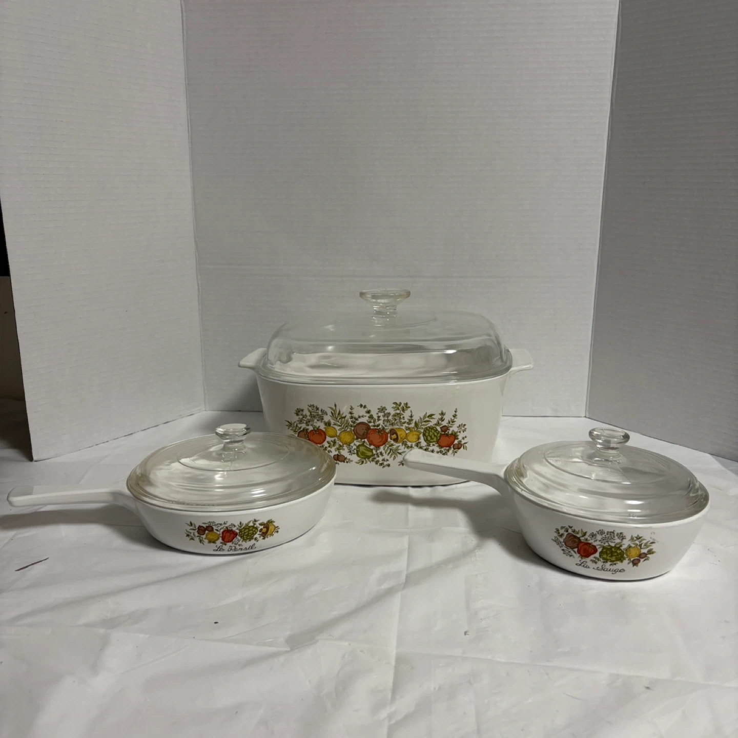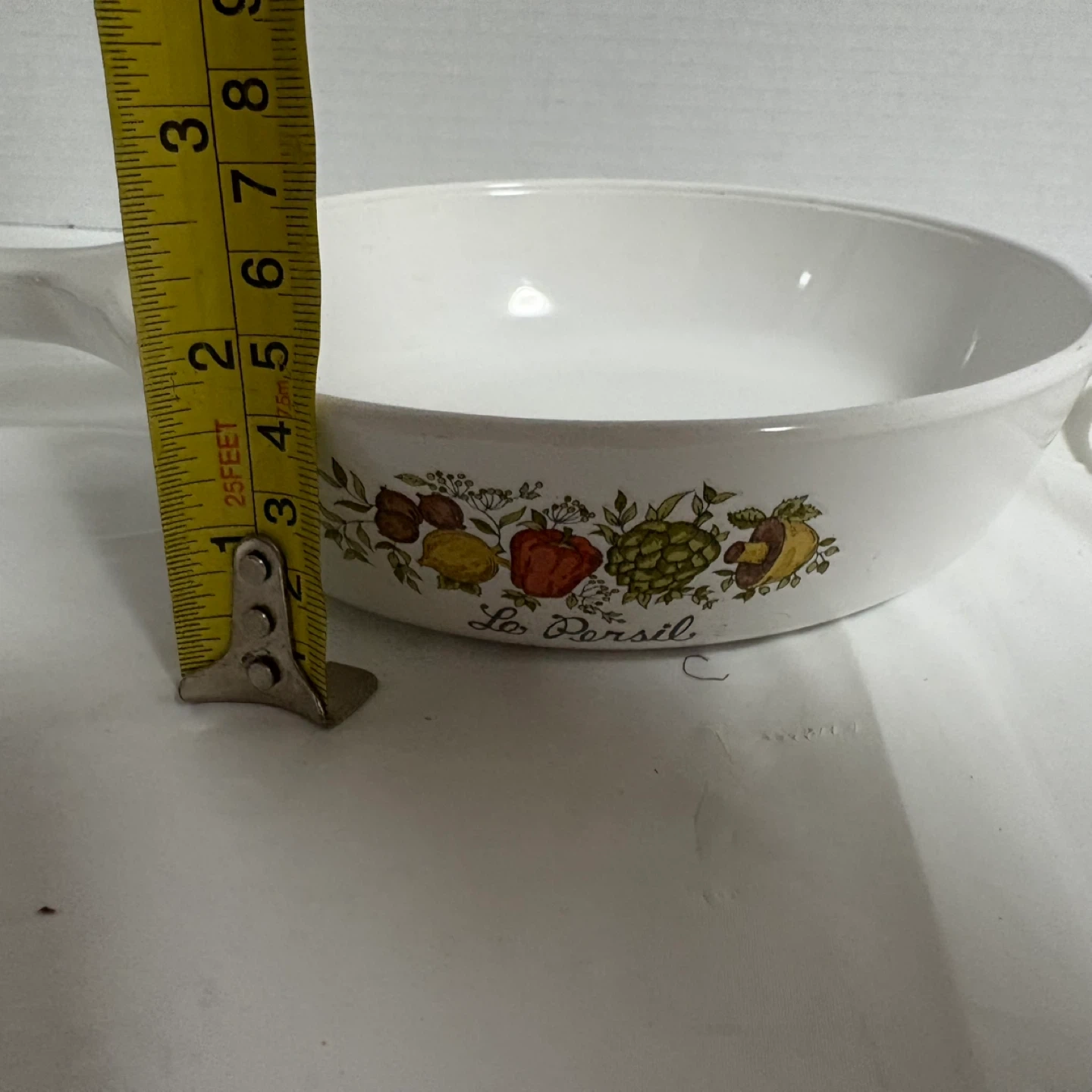 Selling a vintage Corning Ware casserole dish with the "Spice O' Life" pattern. It's in great shape and comes with a glass lid. The dish is white with a colourful vegetable design around the sides. Perfect for cooking and serving your favourite meals!