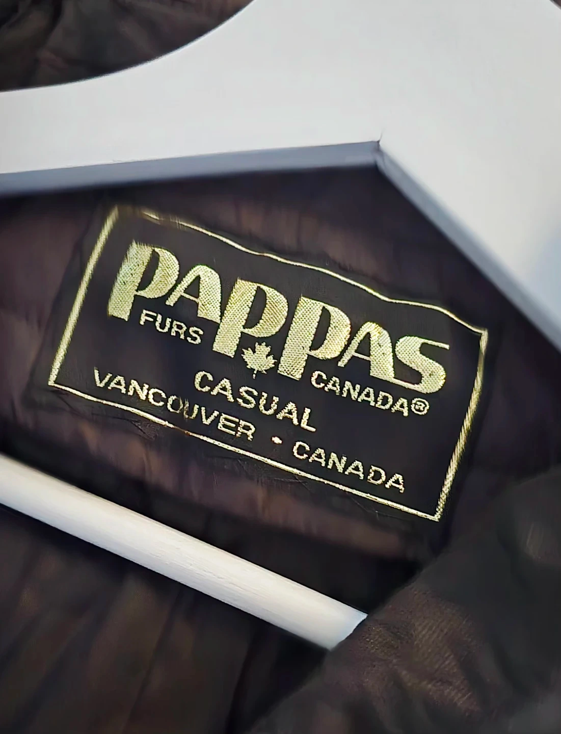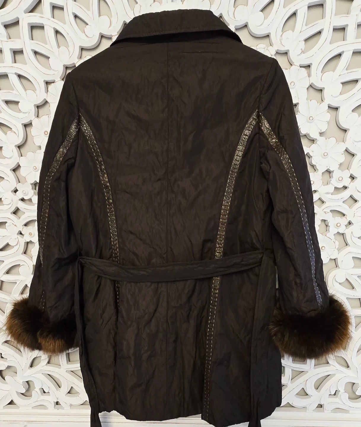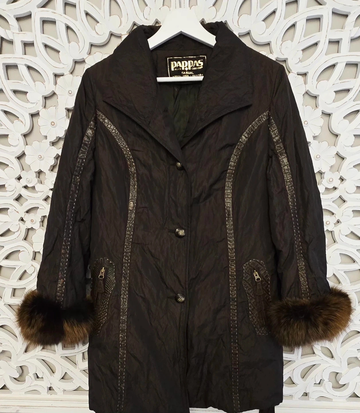 New without tag. Pappas Furs casual coat from Vancouver, Canada. It's a stylish piece with fur accents on the cuffs. The coat is brown and features a belt to cinch the waist for a flattering fit.
