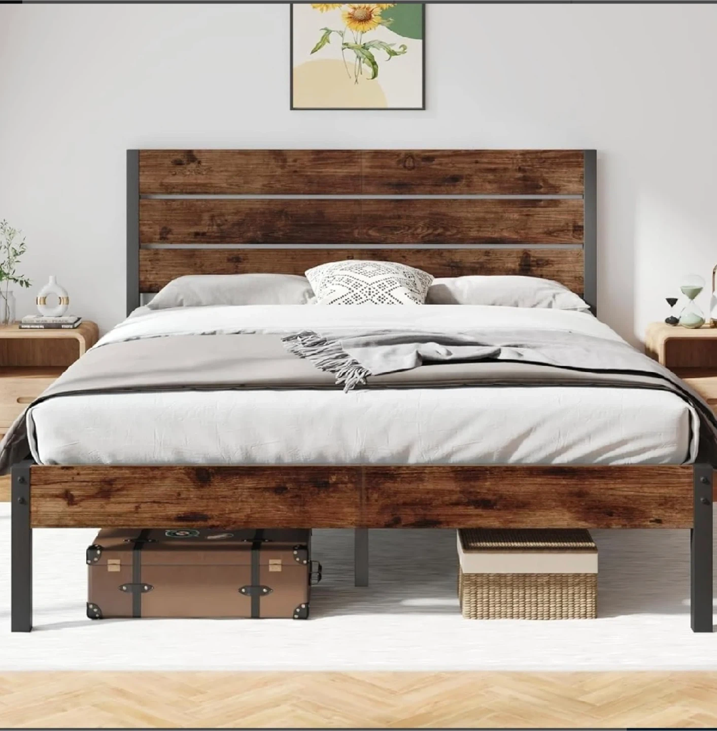 Queen Industrial Metal Bed Frame– Rustic Brown