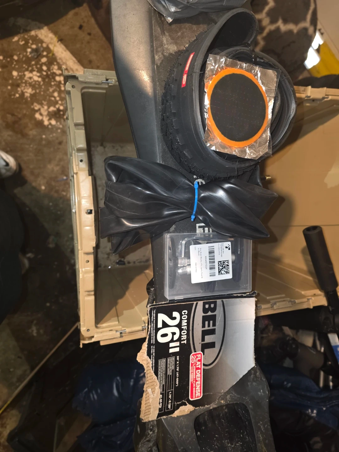 Selling a Bell Comfort 26" x 1.75" bike tire. It's designed with flat defense for a more robust ride. Also includes a tube and patch kit was for my bike got rid of it.Tire and tube size twenty six /1.75 tube is able to hold from forty to sixty five p s I also comes with a patch [ALSO ACCEPT TRADES]
