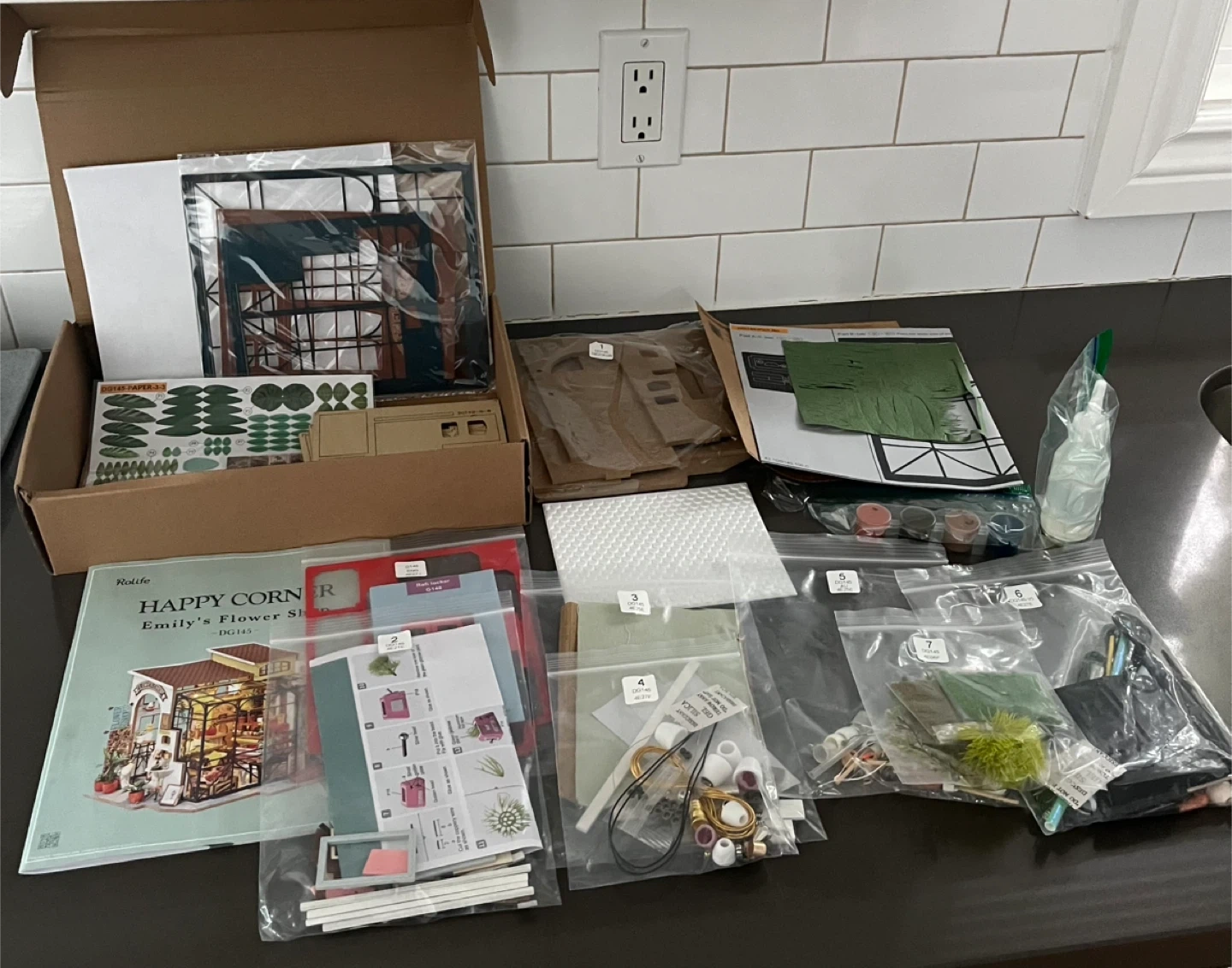 Pick up in Utopia. This Rolife DIY Miniature Dollhouse, Emily's Flower Shop DG145, is a delightful project for hobbyists and crafters. The red locker was started but not completed and is missing the paint brush.