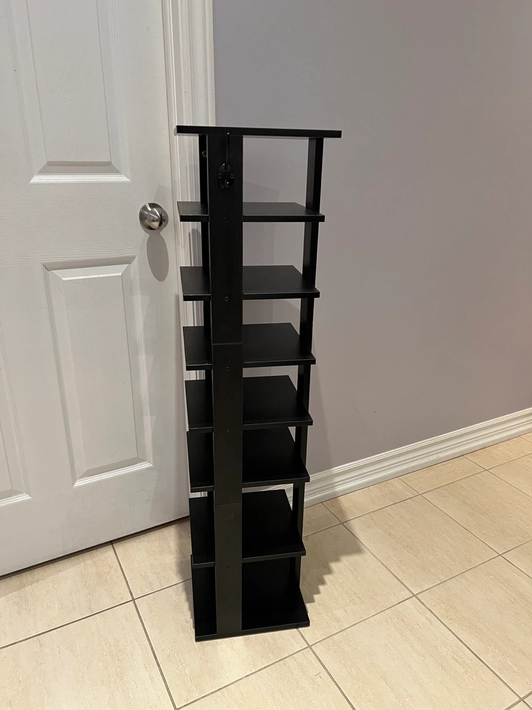 This is a black 7-tier shelf with hooks on top. It's perfect for convenient storage in a bedroom or any space where you need a little extra organization
