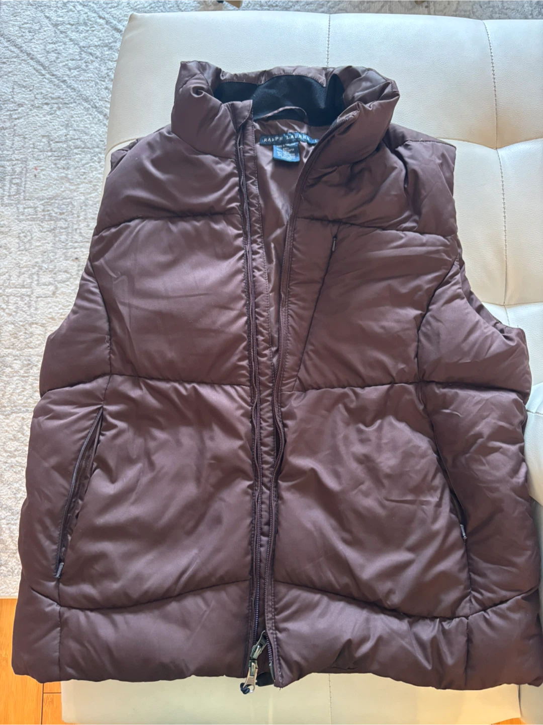 Selling a Ralph Lauren puffer vest in a beautiful brown color. It's in great condition and perfect for layering during the cooler months. This vest is a stylish and practical addition to any wardrobe!