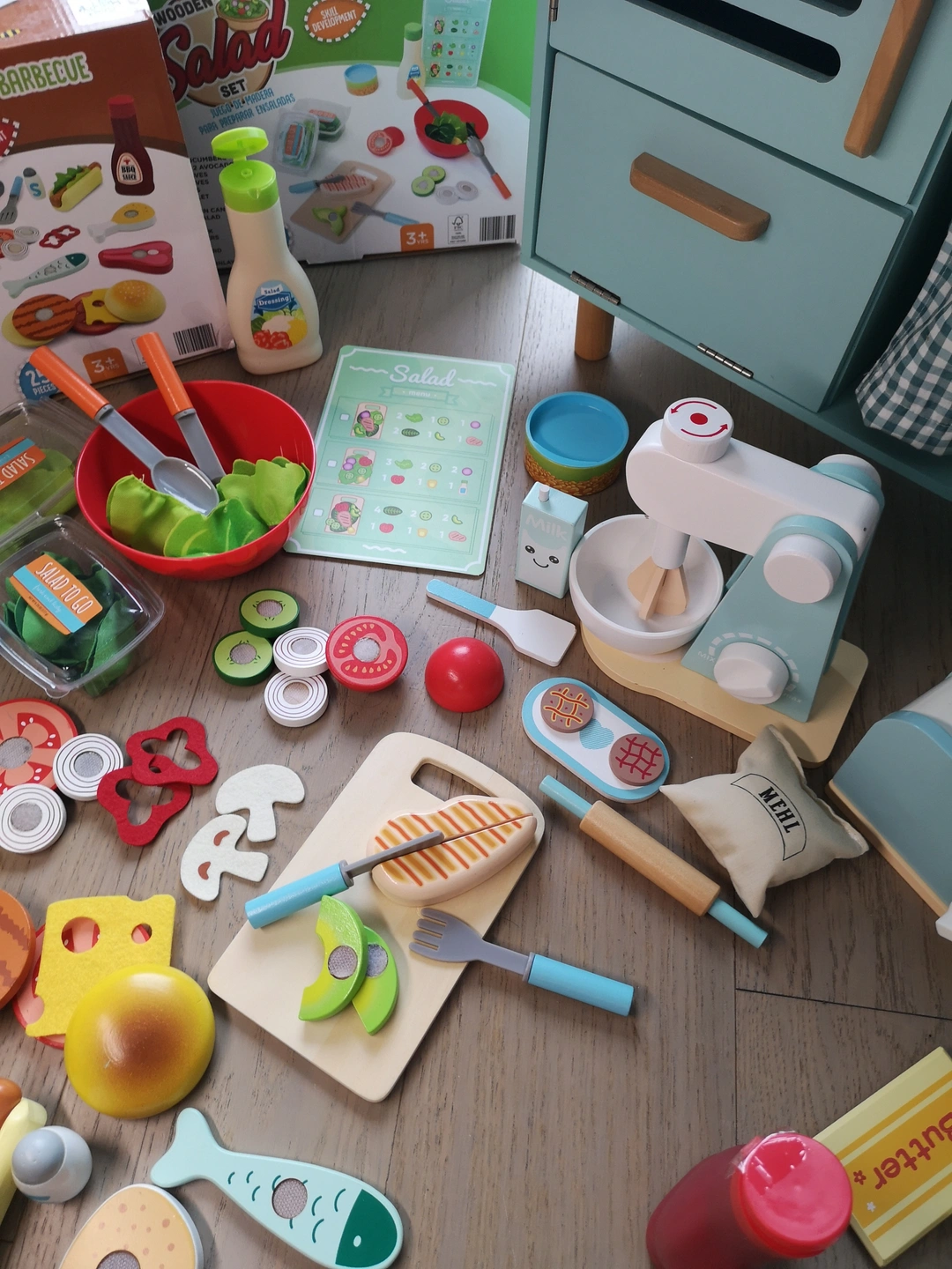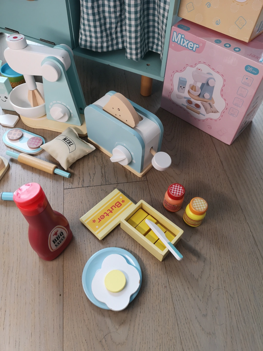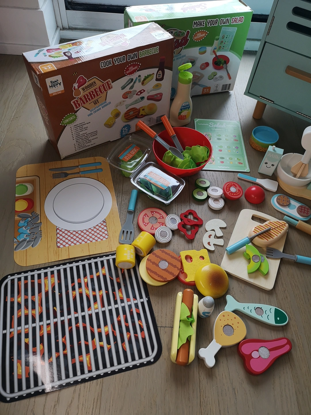 I'm selling a Wooden Food toy 4Sets & Wooden Kitchen- Classic World! Different cooking themes make your little one practice their fingers and create better imagiynation everyday. The food sets includes a BBQ set, breakfast hour, cookie tea time and healthy salad. The Classic World kitchen has a sink, oven, and storage space. Unique color will be the best option matching your environment. Great for kids who love to play pretend chef! Great condition with parts included in the photos.