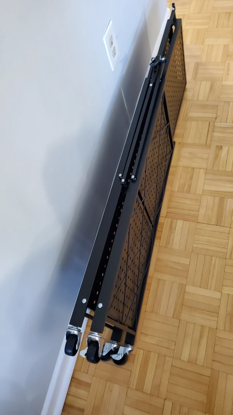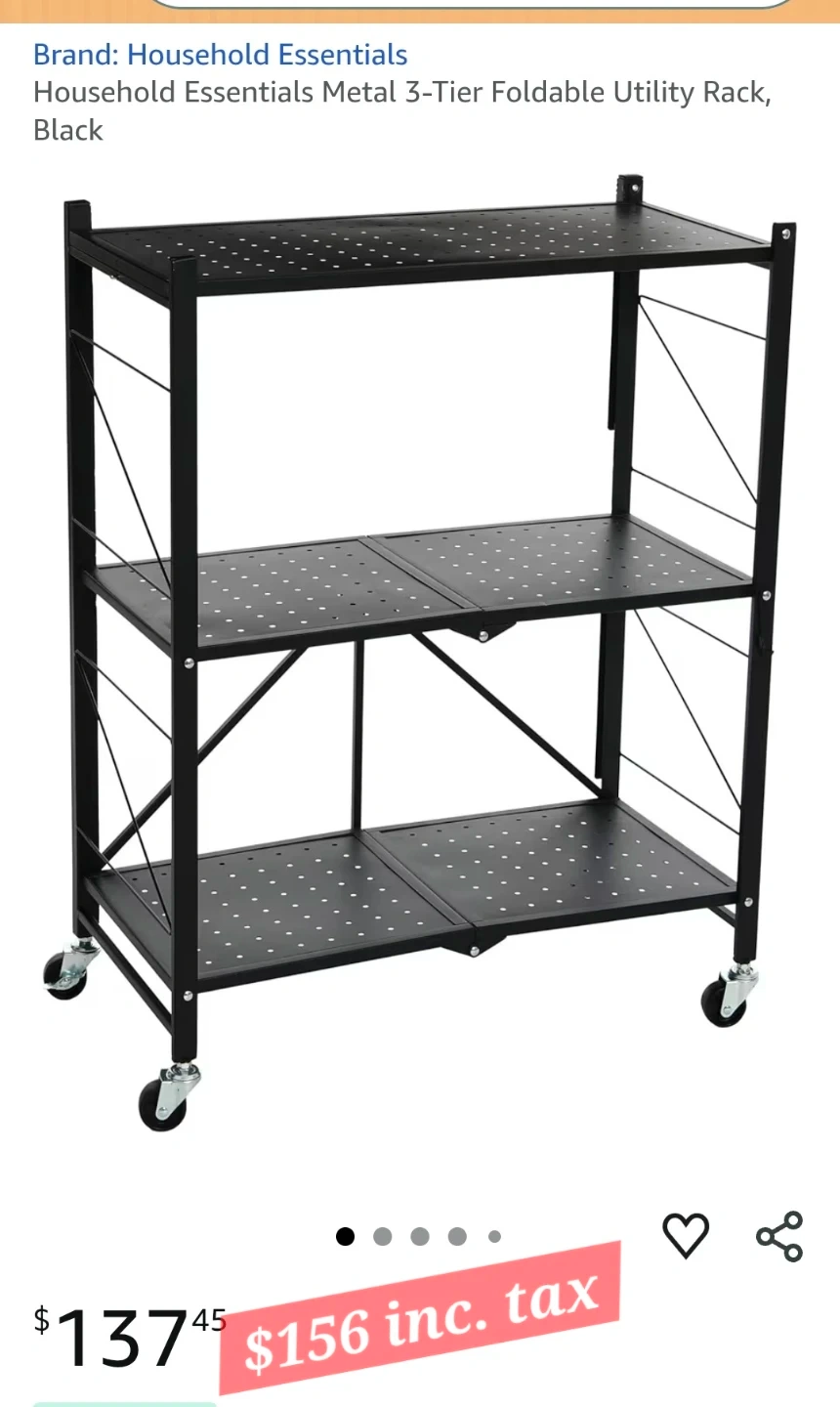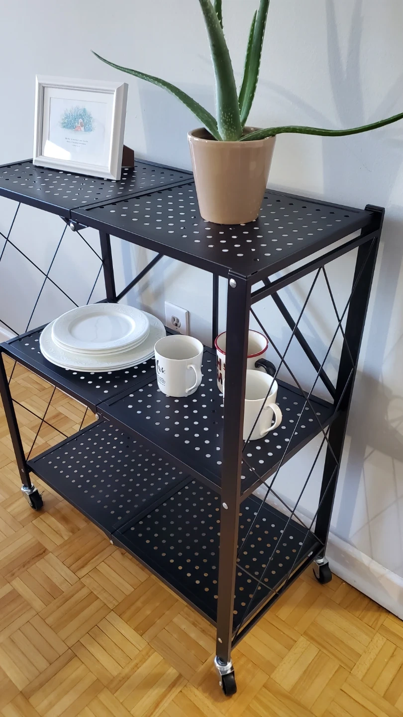 This foldable kitchen rack is only slightly used in very good condition, and easily foldable, made of heavy-duty metal which has 3 shelves w/ max load capacity of 250 lbs each. Wheels make it portable and can also be locked to be stable. Check last pic for dimensions. Please don't ask for a lower price.
