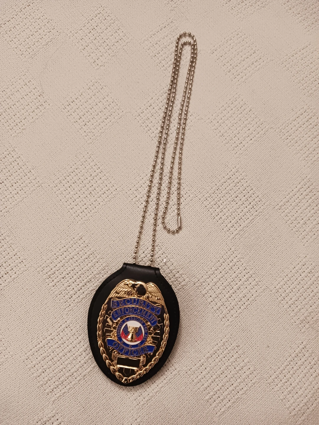 Brand new Security Enforcement Officer badge displayed in a protective black holder with chain.