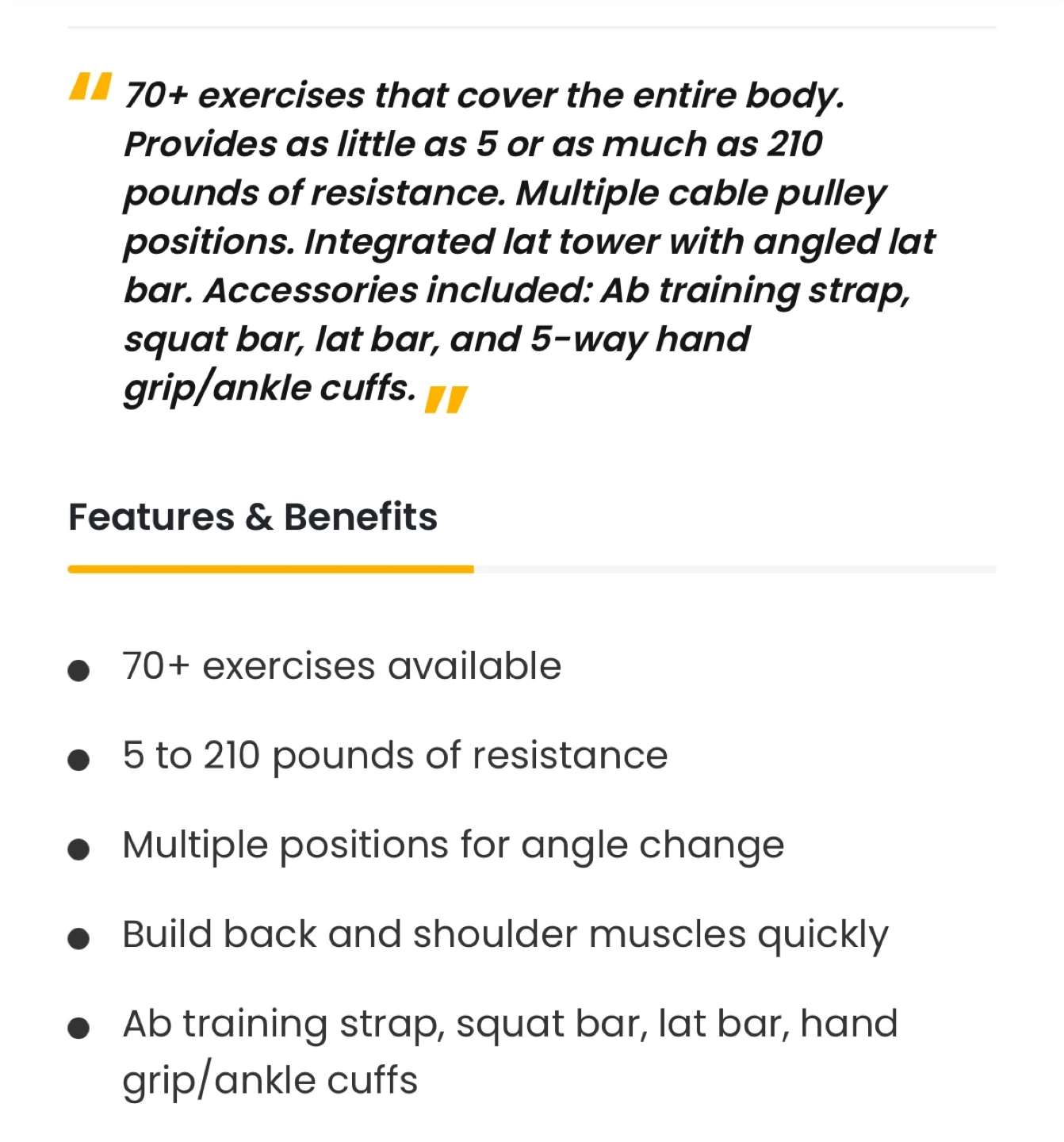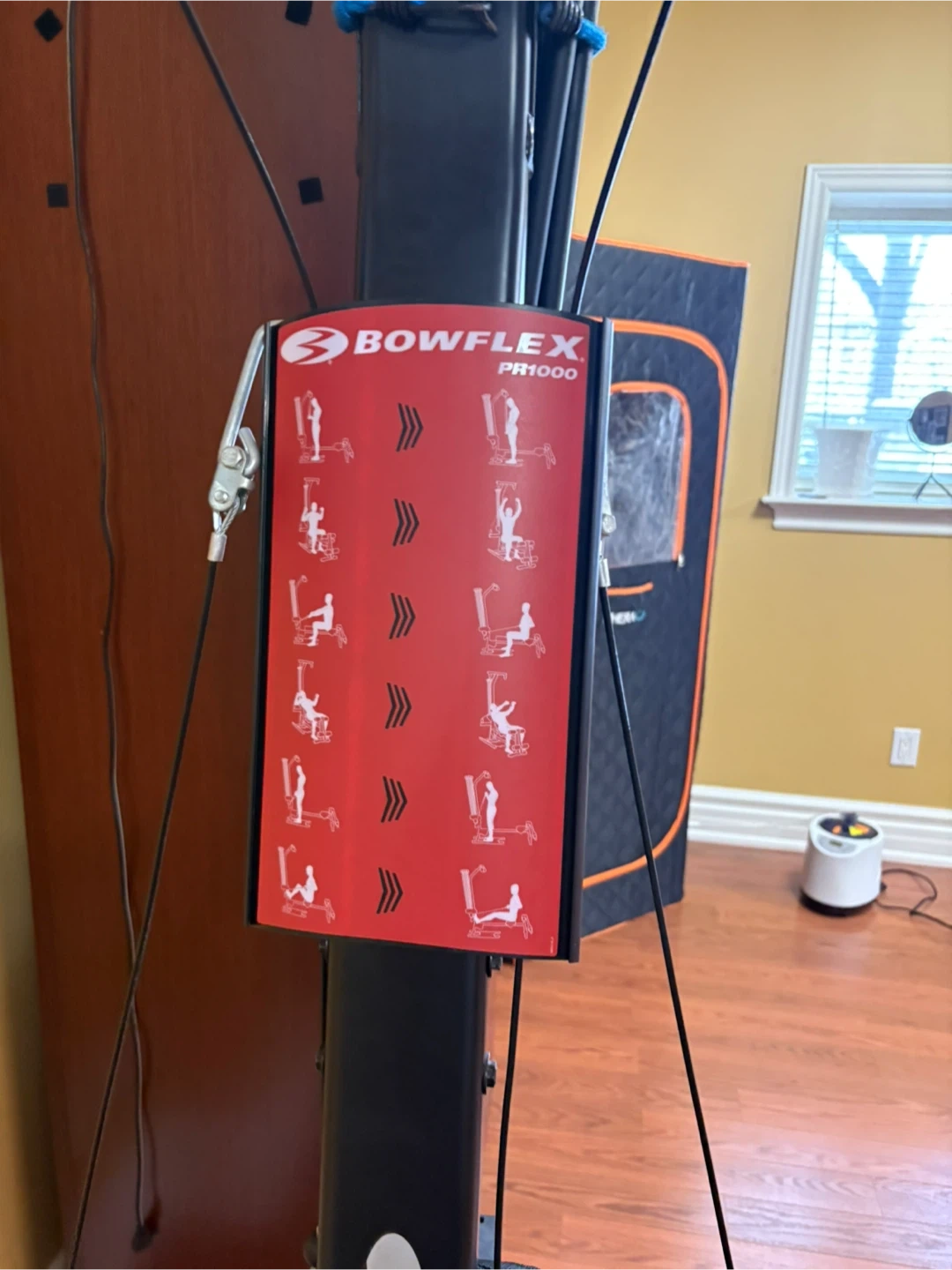 Get a full body workout with this Bowflex PR1000 home gym! It offers over 25 exercises to cover your entire body. The power rod resistance provides over 200 lb of resistance. Multiple cable pulley positions allow you to easily change the angle of resistance and increase the effectiveness of many exercises. It also features a vertical bench press with incline and flat adjustment that converts to a rolling seat for aerobic rowing and a device holder to support your smart device