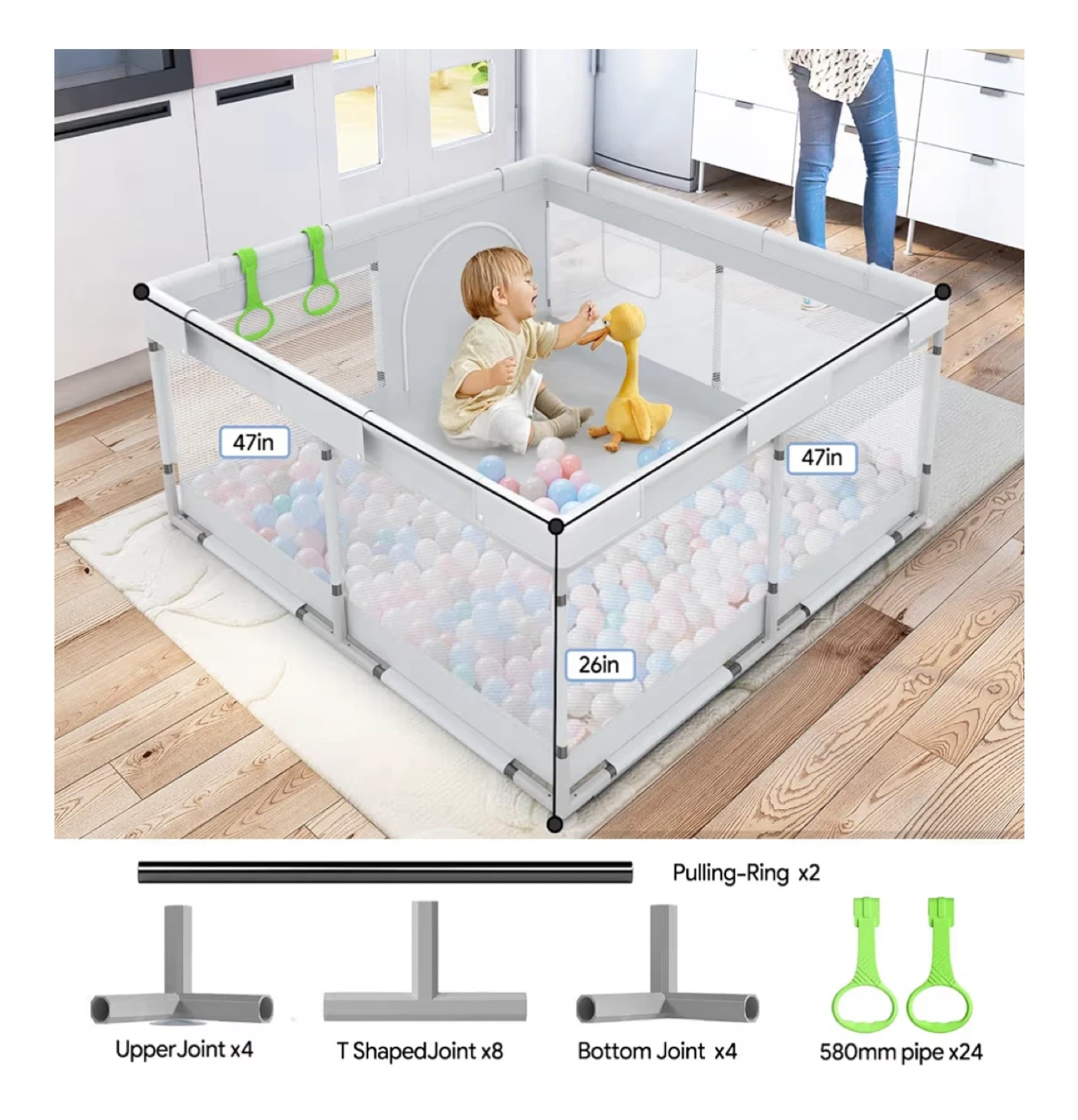 Selling a baby playpen, perfect for keeping your little one safe and entertained! It measures 47x47 inches and 26 inches in height. Includes pulling rings and all the necessary joints and pipes for easy assembly.