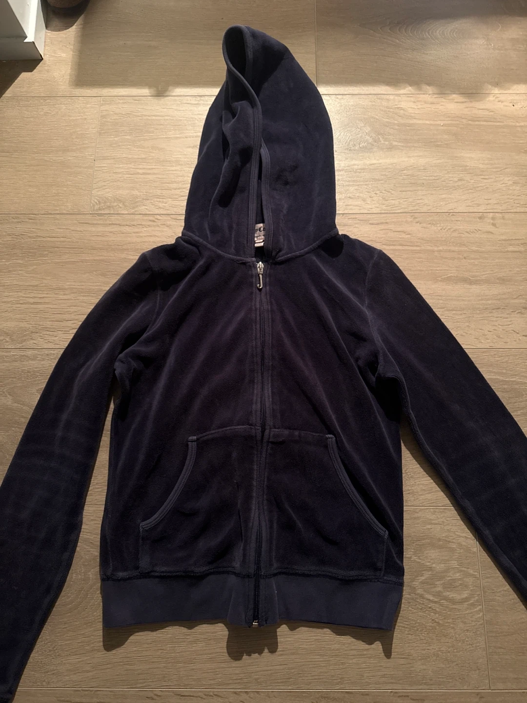 Selling a Juicy Couture velour hoodie in size small. It's a beautiful dark blue colour with the classic Juicy logo on the back. Super comfy and in great condition.