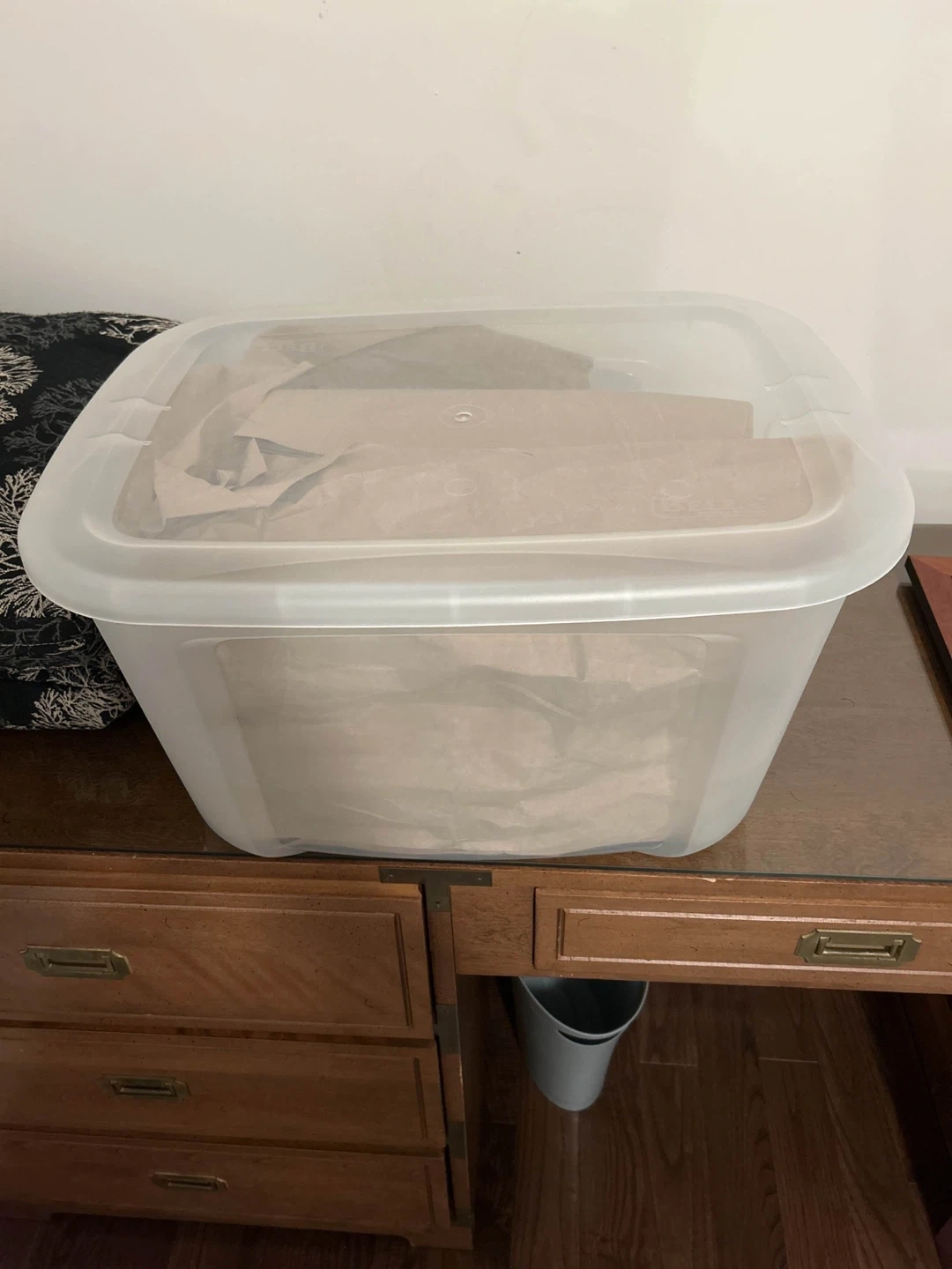Items have always been stored in a storage container with a lid in room temperature condition in my bedroom.