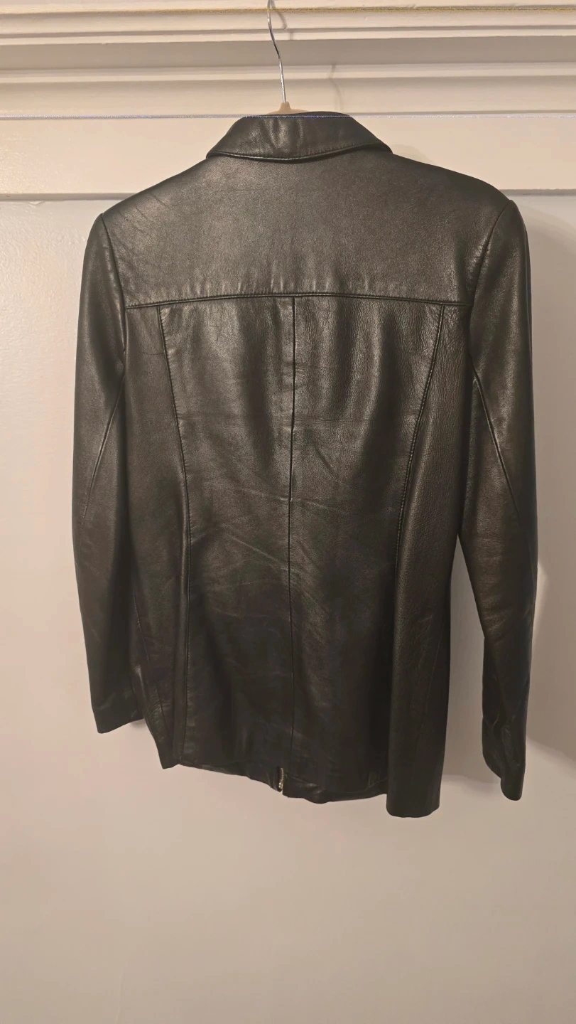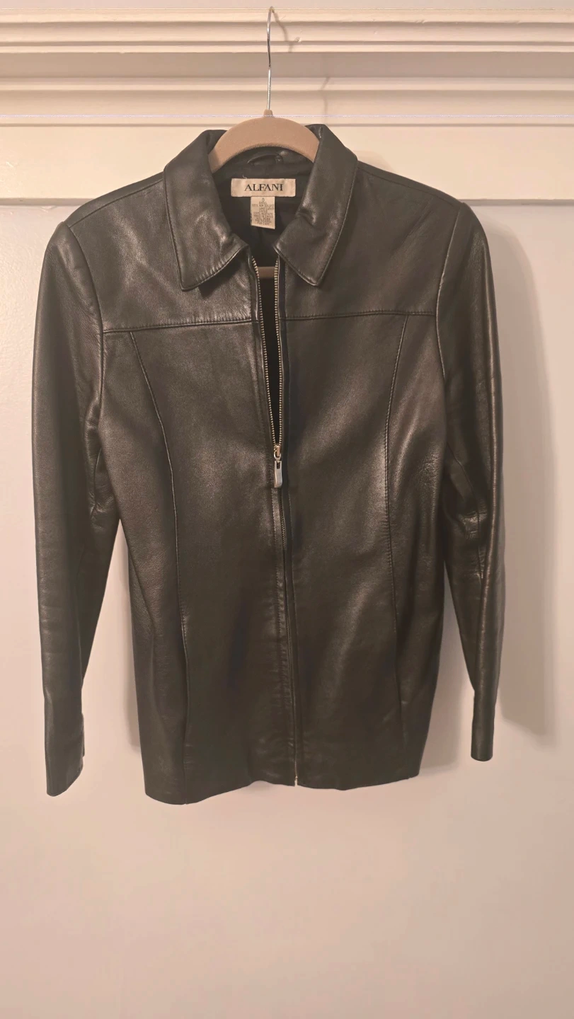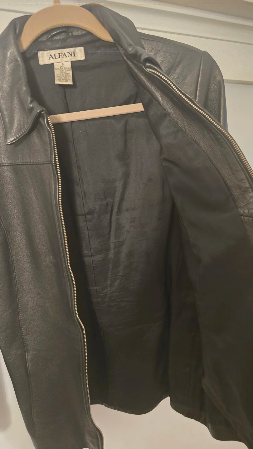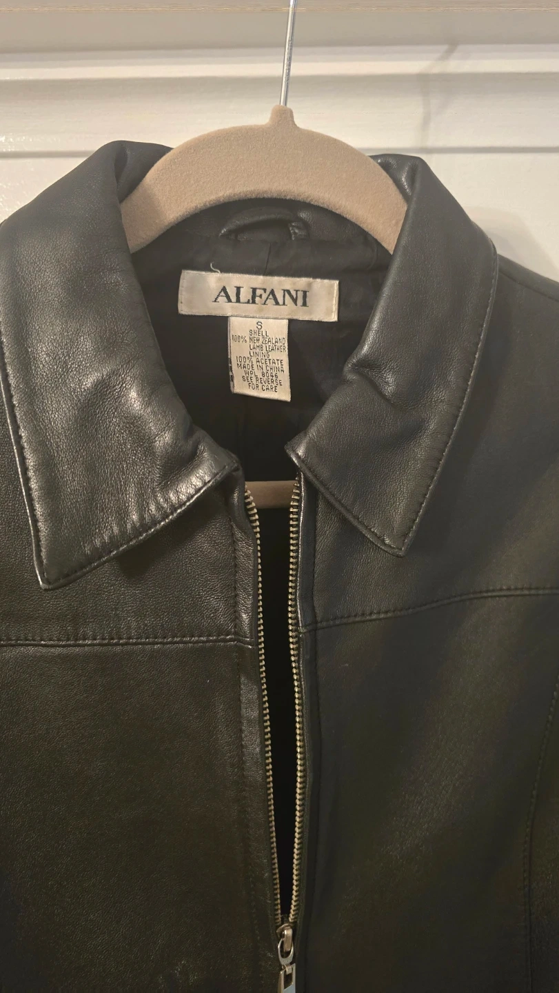 Selling a stylish Alfani black leather jacket in size small. It's made with 100% New Zealand lamb leather for the shell and has a 100% acetate lining. Perfect for adding a touch of edgy sophistication to any outfit!