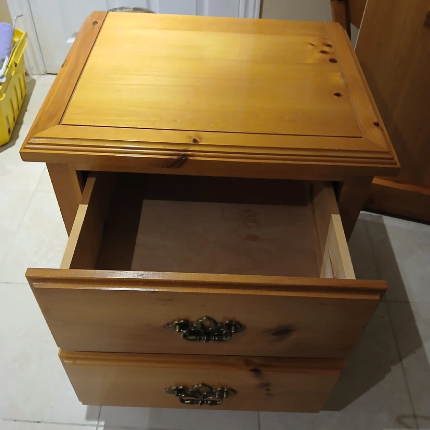 The nightstand has two drawers for storage, perfect for keeping bedside essentials close at hand. Great for home or cottage