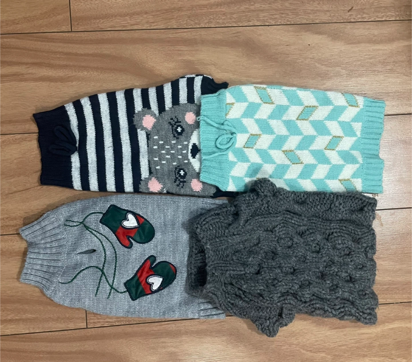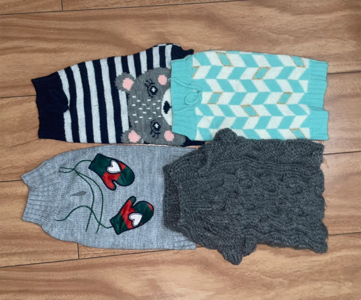 Selling a set of dog sweaters in small size! They are in great condition and perfect for keeping your furry friend warm during the colder months. You'll receive four sweaters in total, each with unique designs and colours