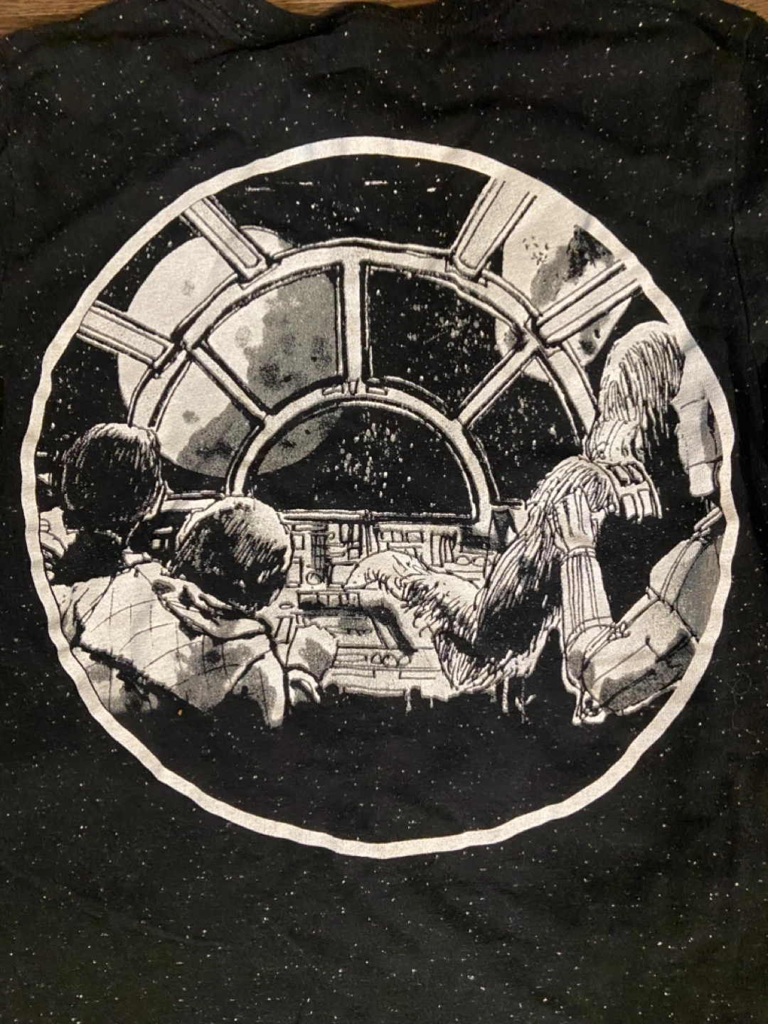 It's black with a cool Star Wars design featuring the Millennium Falcon & crew on the back