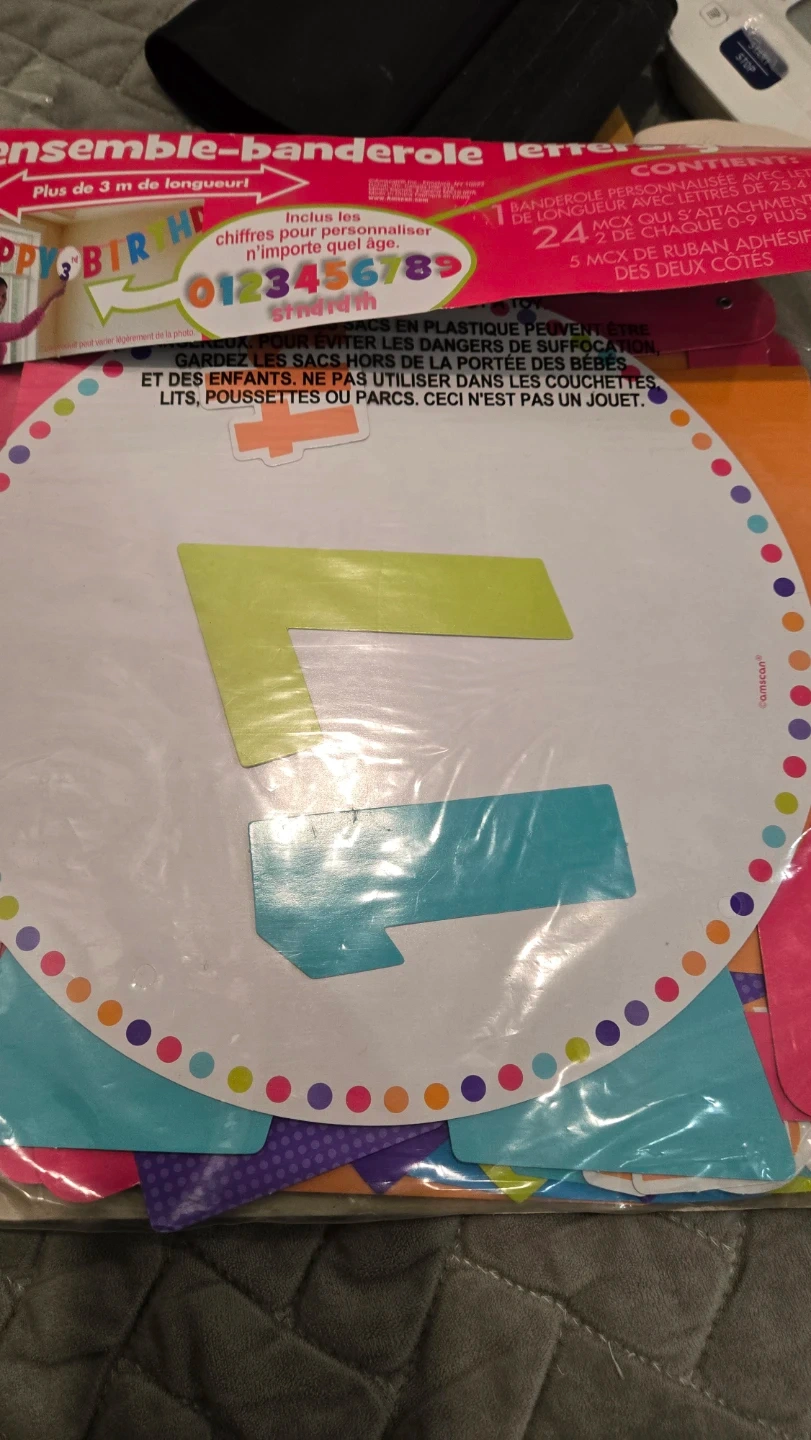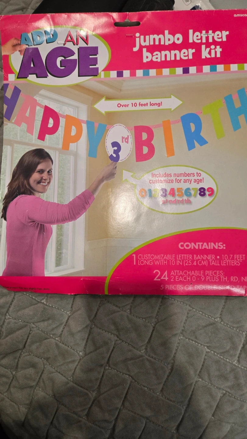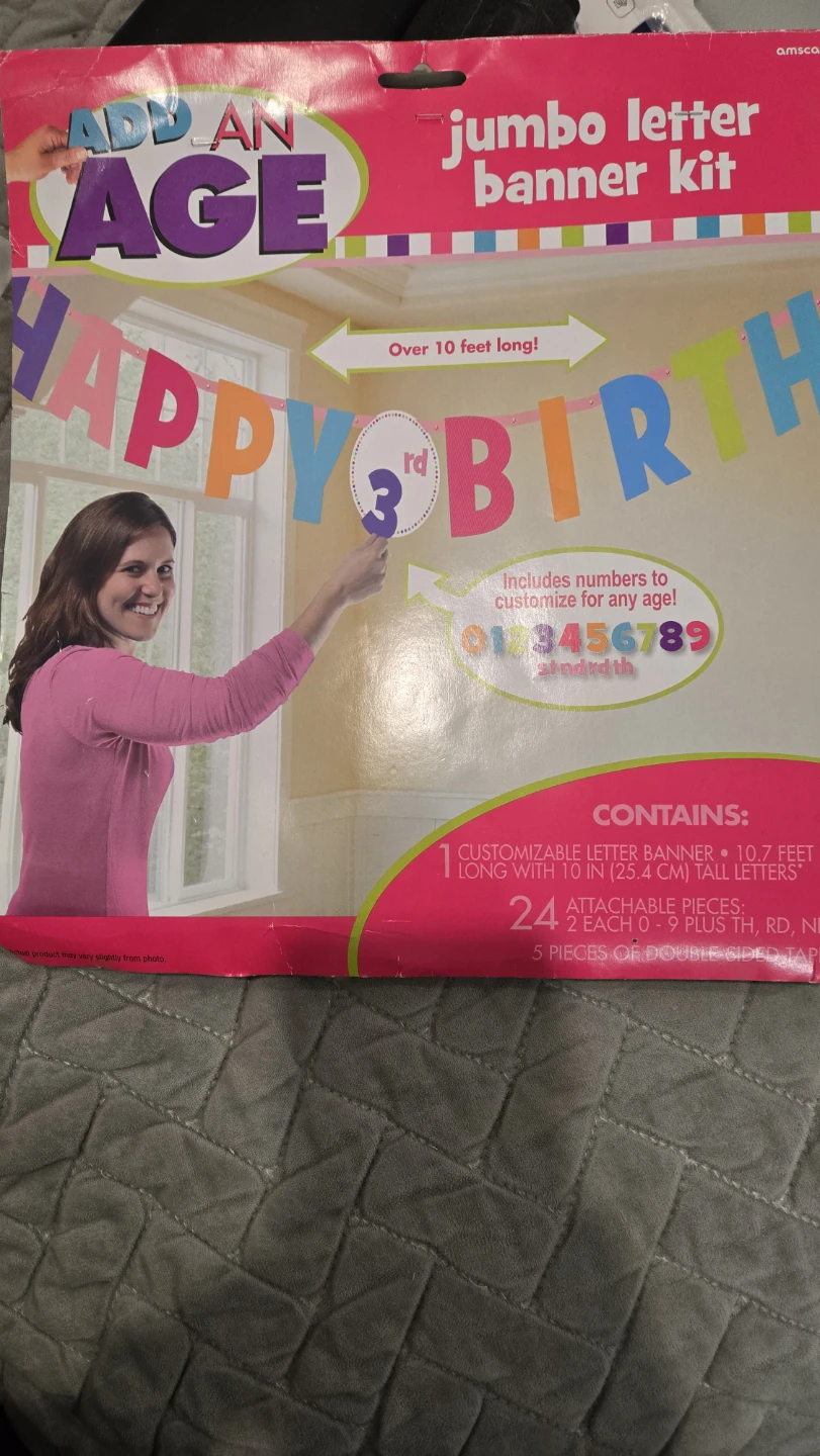 Selling an Add An Age jumbo letter banner kit! It's over 10 feet long and includes numbers to customize for any age. The kit contains one customizable letter banner that is 10.7 feet long with 10 inch tall letters and 24 attachable pieces, two of each 0-9 plus TH, RD, ND, and ST