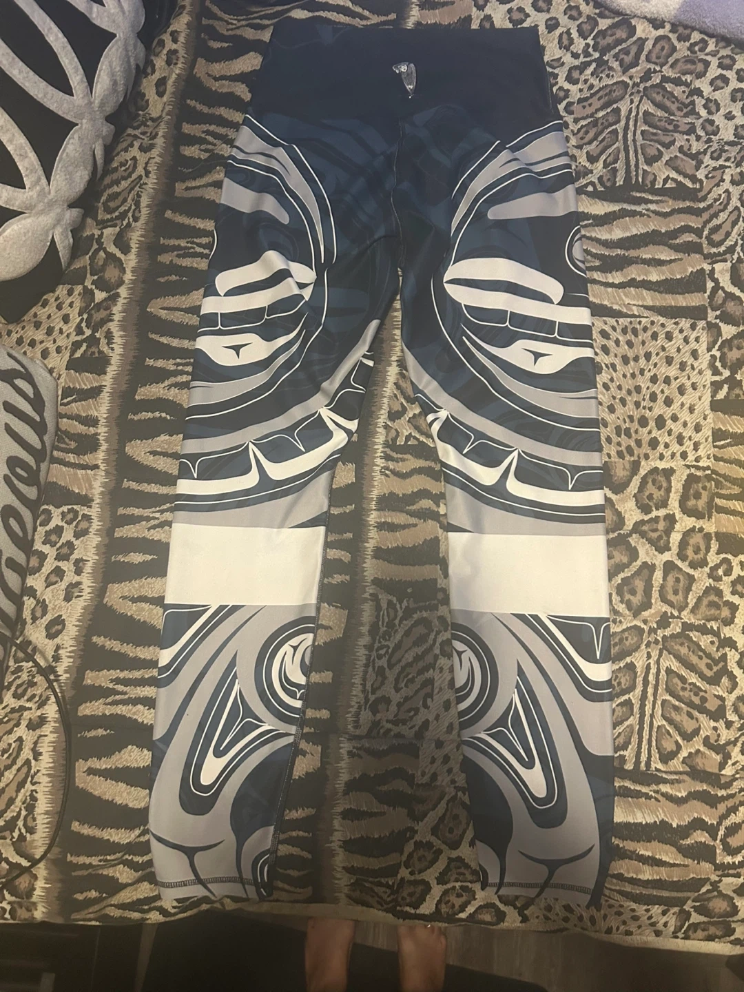 NoMiNou Activewear leggings in size XS. They are designed, printed, and made in Canada. The material is 88% recycled polyester and 12% elastane. Wash with like colours in cold water on gentle cycle, lay flat or hang to dry