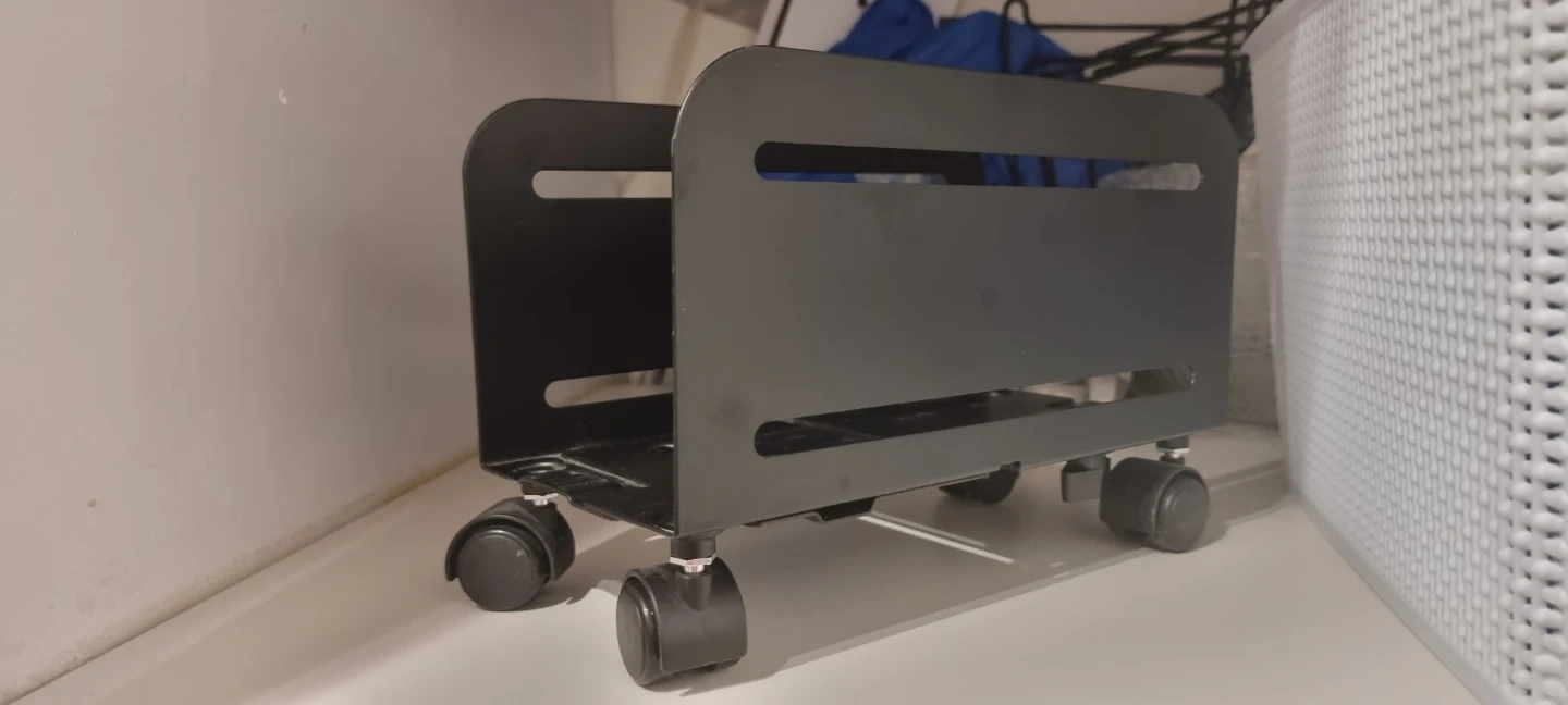 This is an adjustable computer tower stand with wheels, the width is adjustable. It's in great condition and ready to keep your computer tower off the floor and easily accessible.