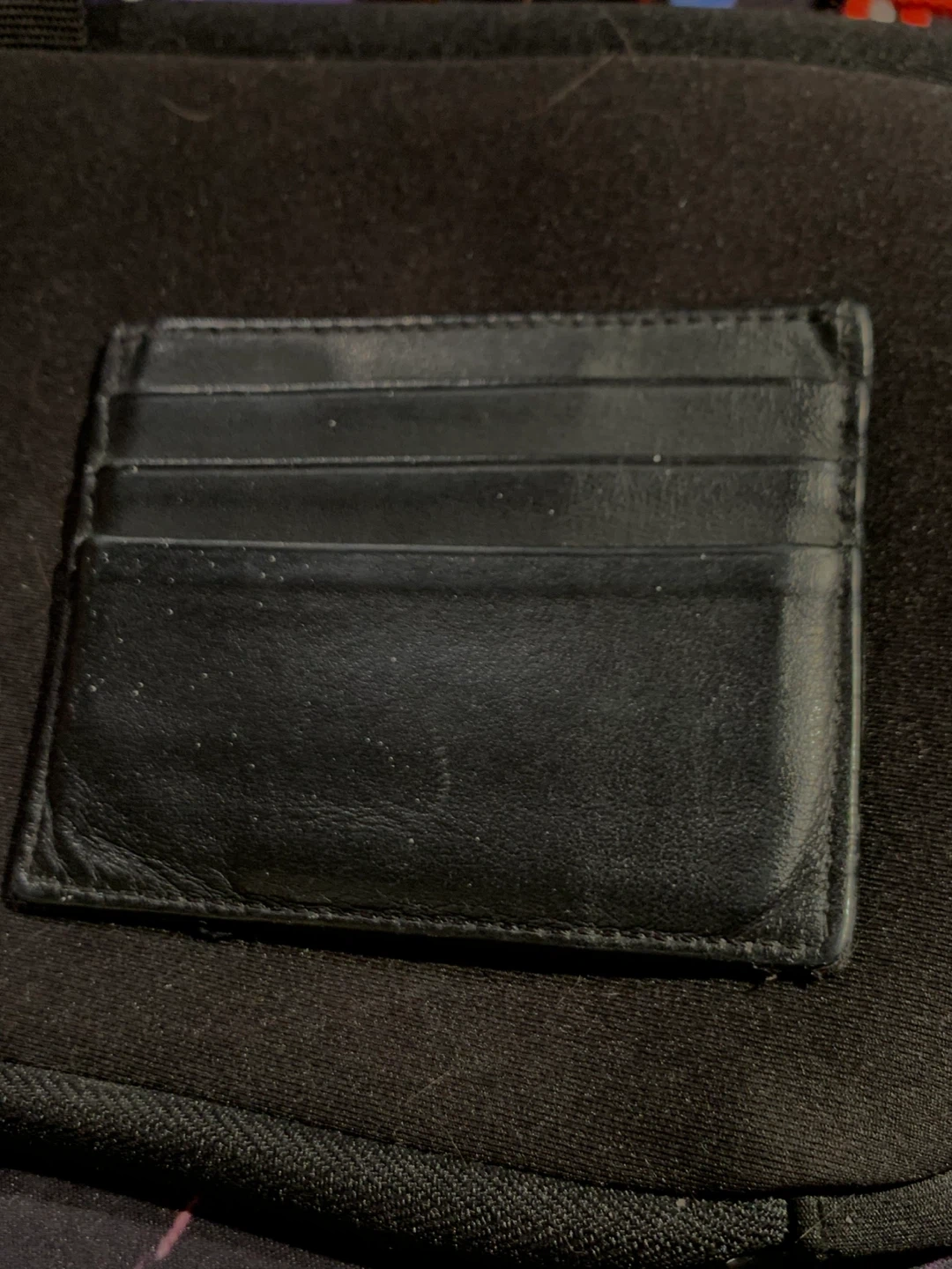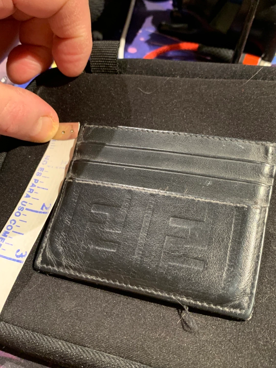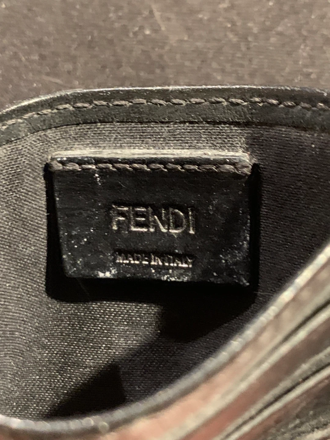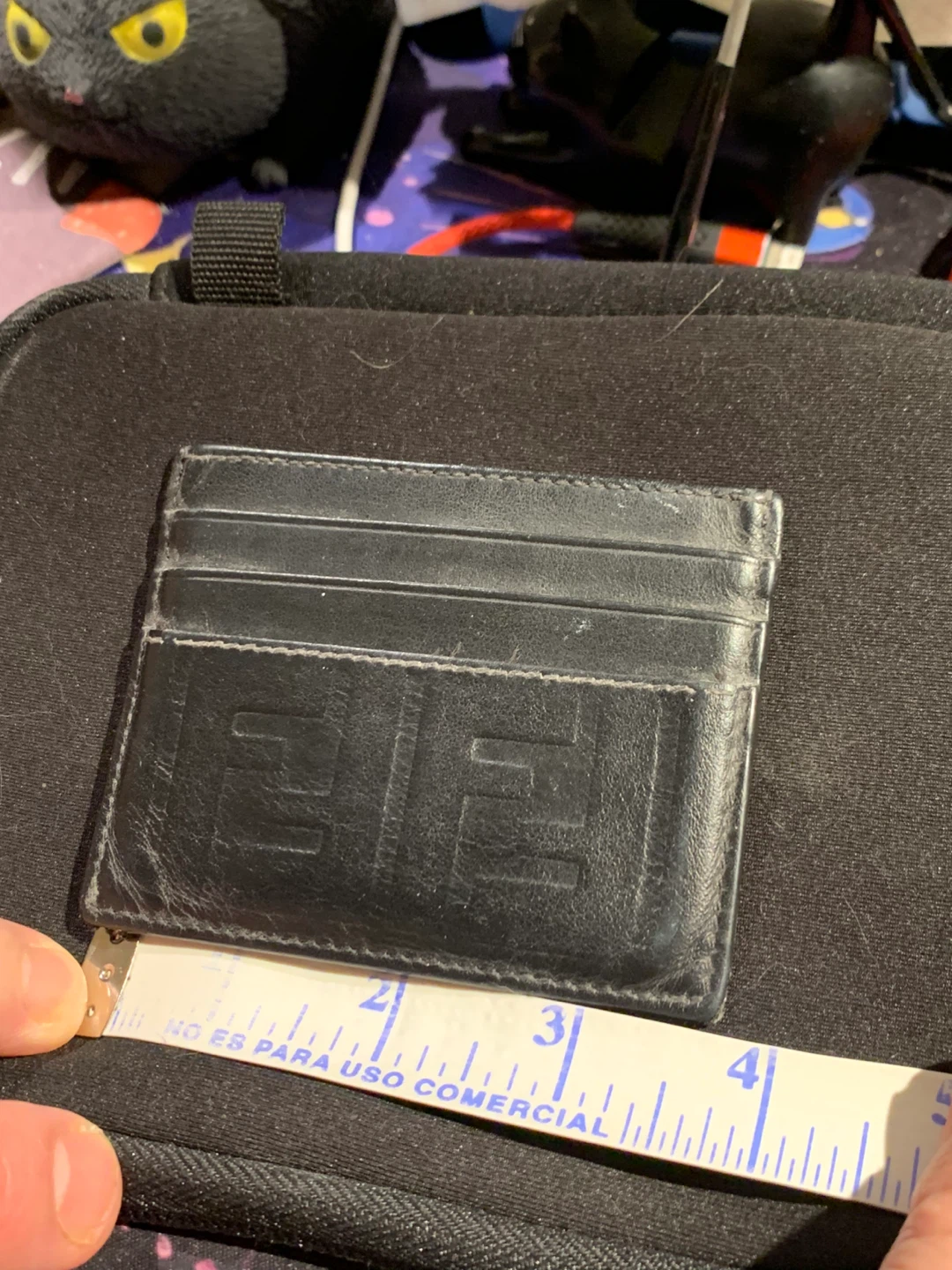 Selling a Fendi card holder in black leather. It's in used condition. The size is approximately 4 inches by 3 inches. The model number is 7M0164 A18A 188-0274