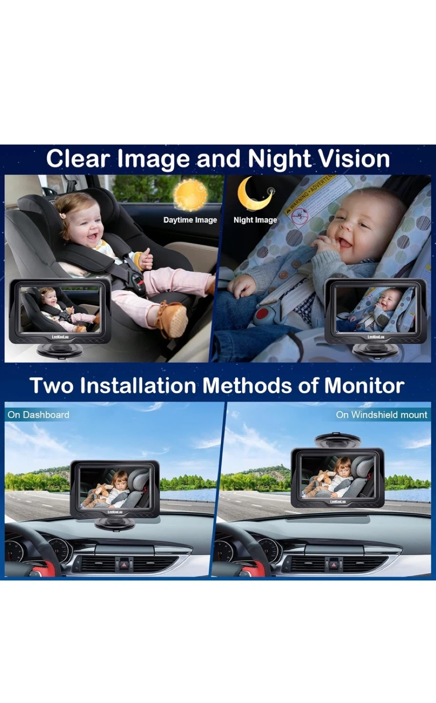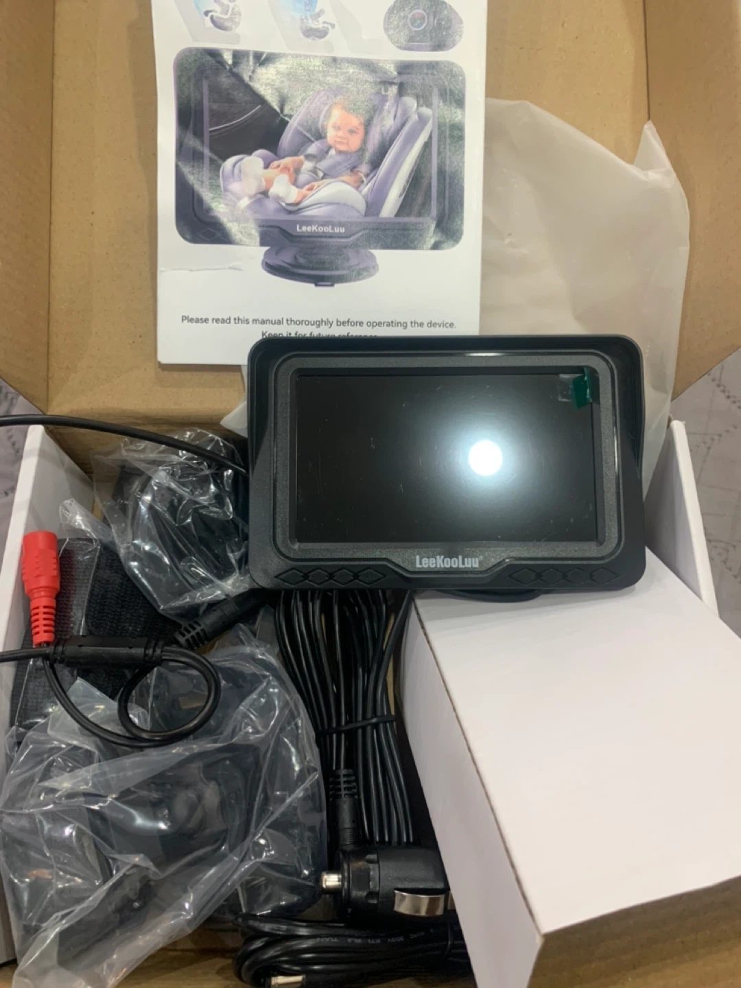 Selling a brand new LeeKooLuu LK12 baby car camera! This camera is designed to give you a wide angle view of both back seats when the camera is mounted on either car seat headrest. It's suitable for newborns, toddlers, and even pets! The box is included