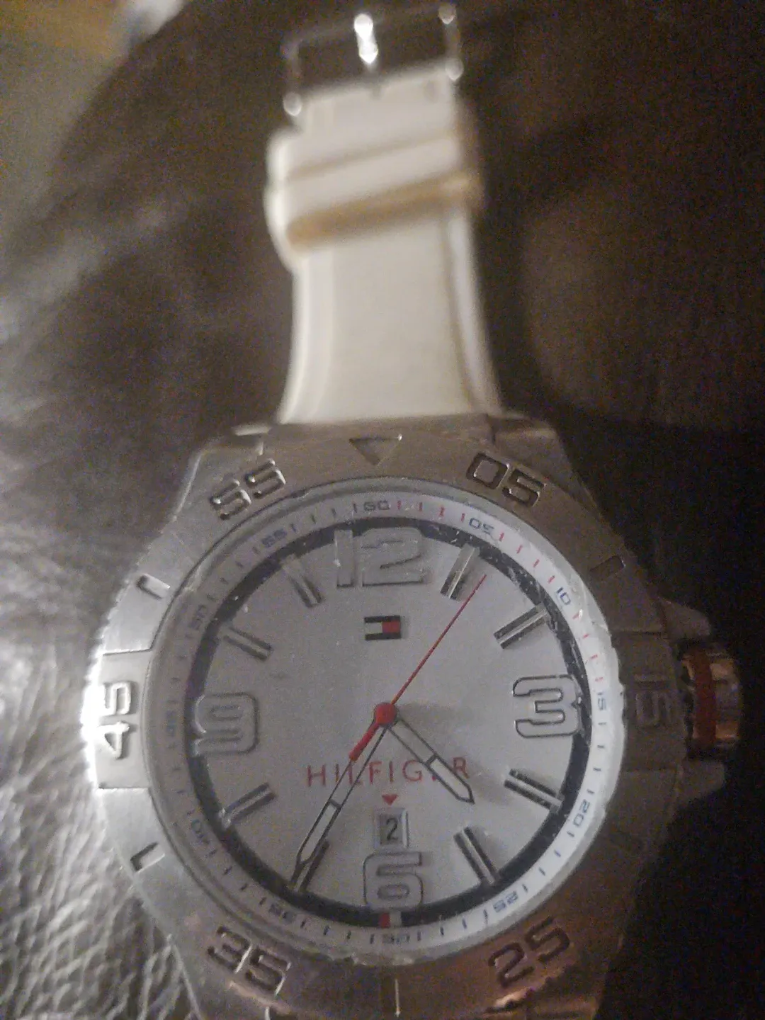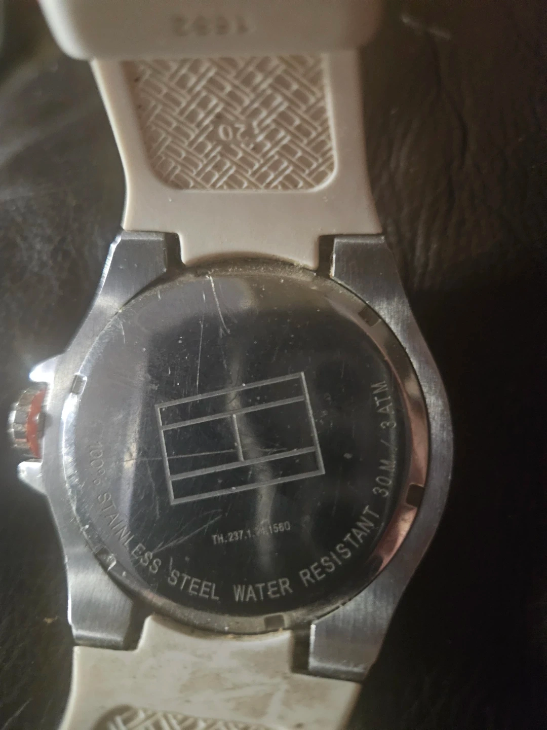 Selling a Tommy Hilfiger watch with a white band and stainless steel case. It's water resistant up to 30M. The back is marked with TH.237.1.14.1580. It shows some signs of wear.