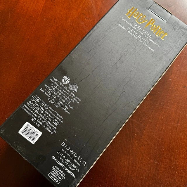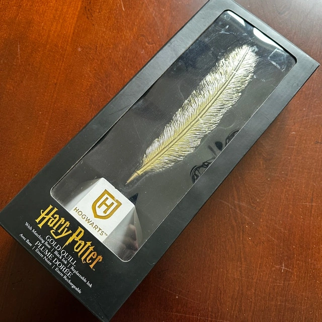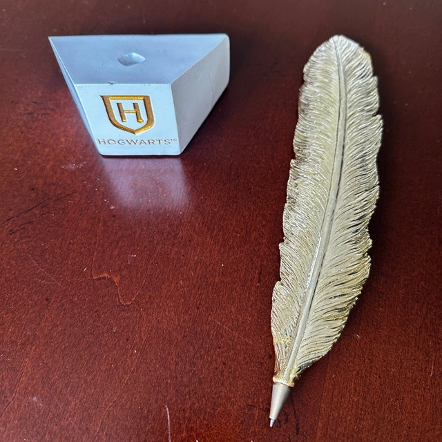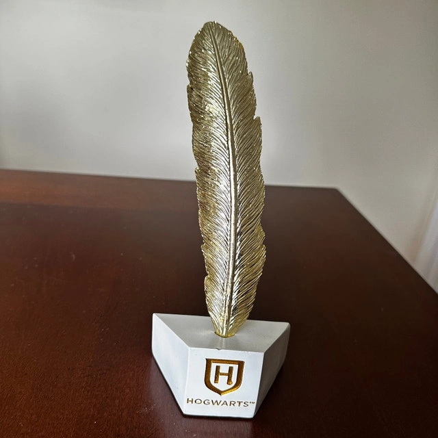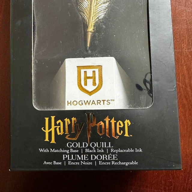 Gorgeous official Warner Bros. licensed Harry Potter Hogwarts Gold Feather Quill Pen with matching display stand. Never used — perfect gift for any fan or collector. It's in like-new, gift-ready condition — the box was only opened to take photos, and the pen itself has never been written with. The feather is made of solid metal with detailed sculpting, stands approx. 8.5" tall, and the base displays the Hogwarts crest (H). Looks amazing on a desk, bookshelf, or as part of any wizarding décor. Great as a collectible or a functional pen — the ink cartridge is replaceable. Selling for $20 firm. Pickup location in Etobicoke near Gardiner Expy (by Park Lawn)