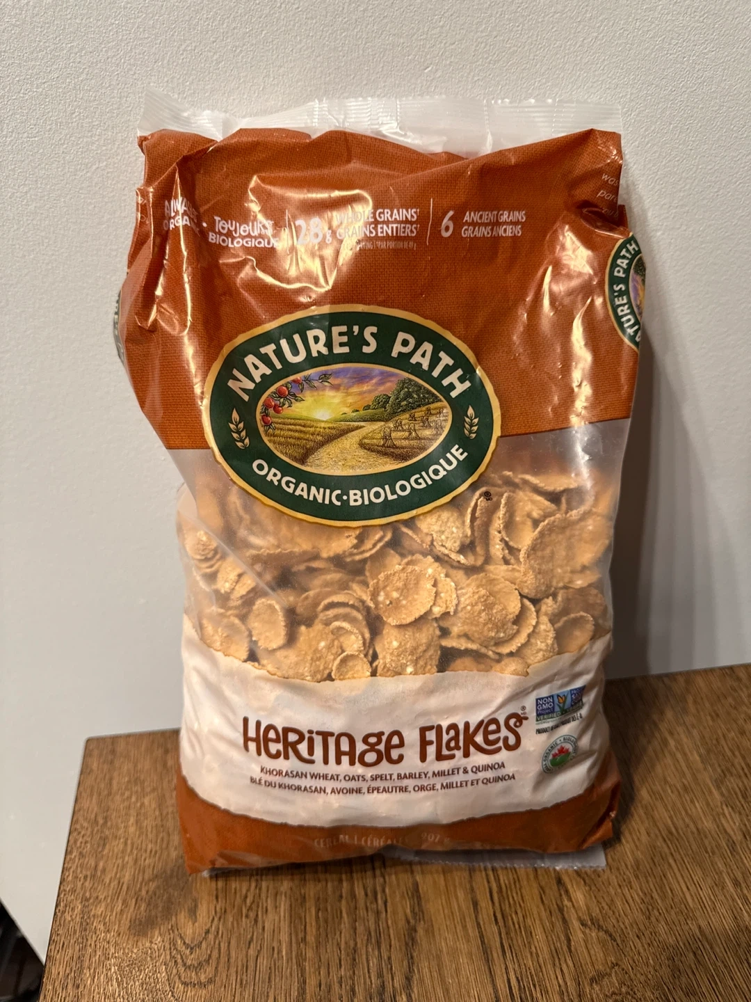 Selling an unopened bag of Nature's Path Heritage Flakes cereal! It's organic and contains ancient grains like khorasan wheat, oats, spelt, barley, millet, and quinoa.
